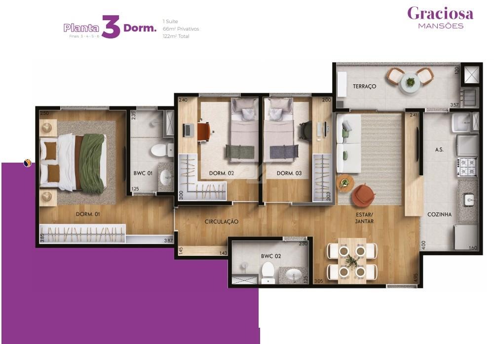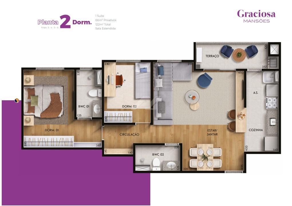 Apartamento com área privativa: 66 m², com opção de planta para 2 dormitórios (com 1 suíte) ou 3 dormitórios (incluindo 1 suíte), conforme escolha do cliente