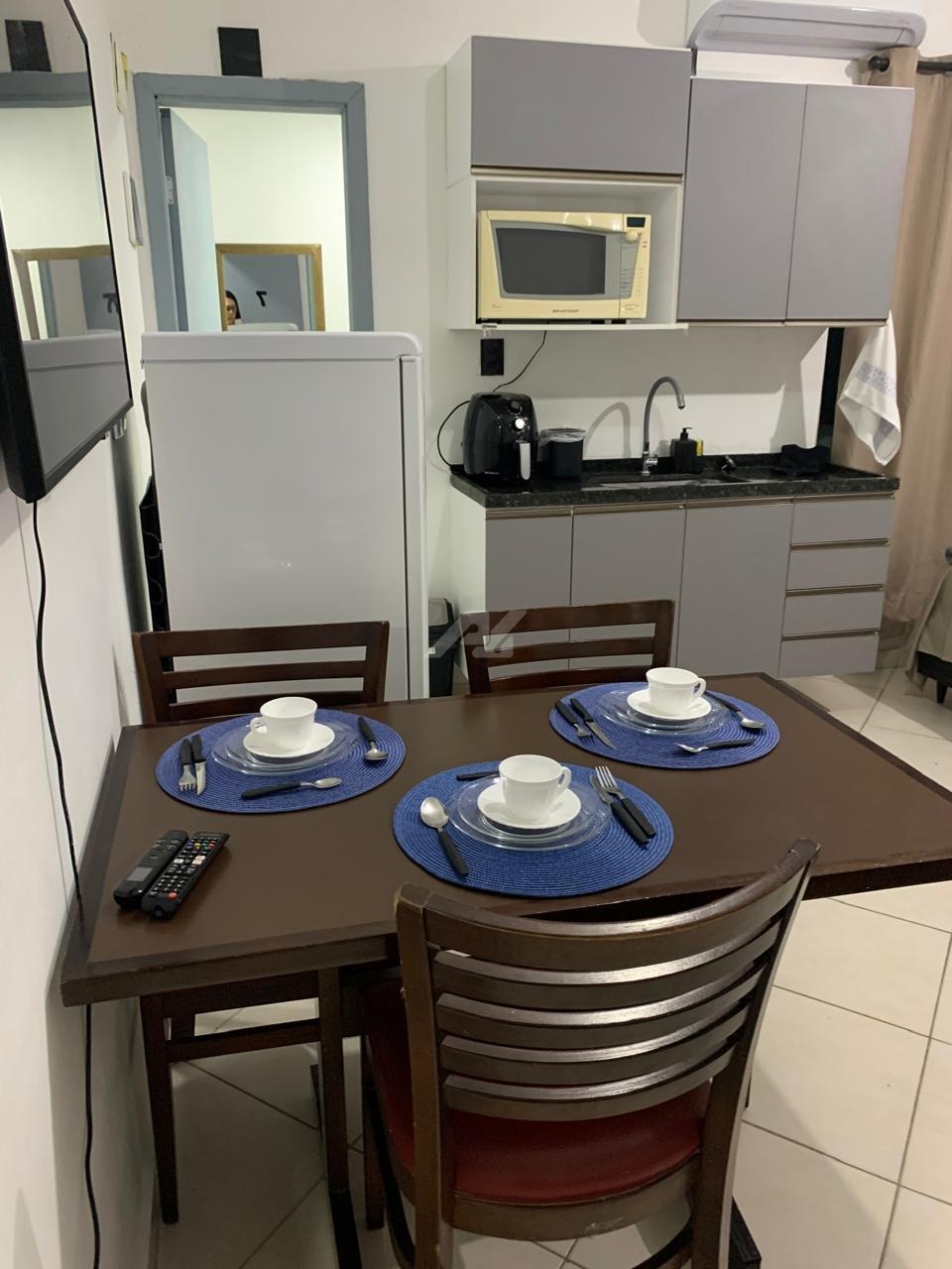 Equipados com: ar condicionado, cama de casal, guarda roupas, pia de cozinha com armários e bancada, forno micro-ondas, air frayer, mesa de refeições com cadeiras, sofá, banheiro privativo, lavanderia coletiva e Internet.