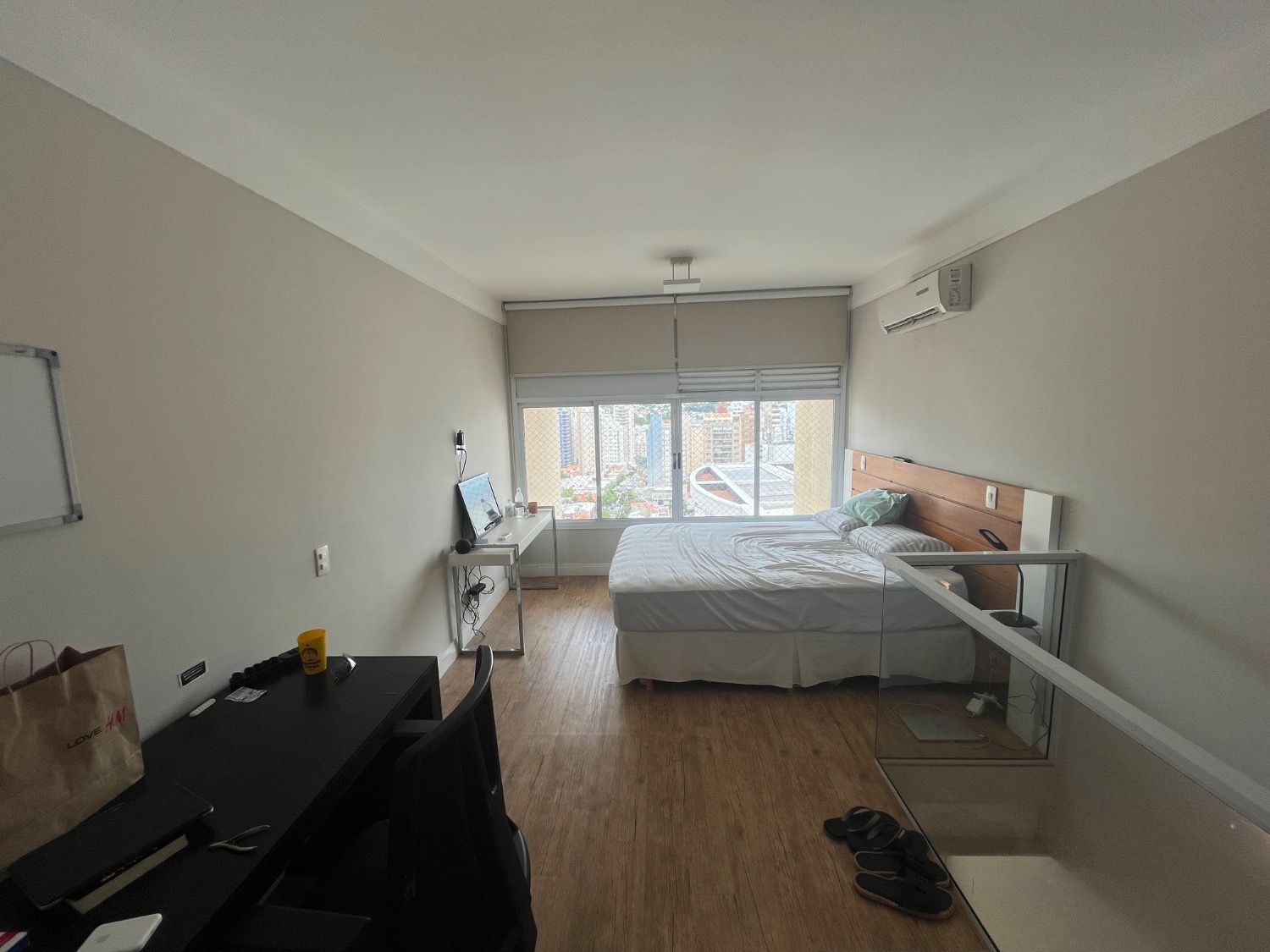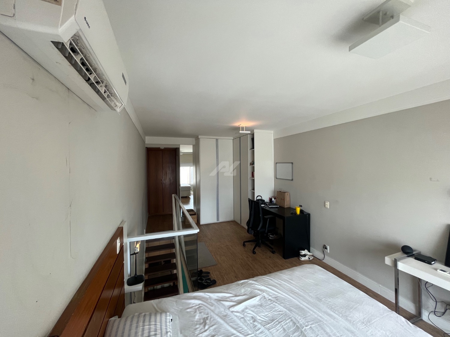 No piso superior, 1 suíte confortável, com piso estendido até a janela, espaço que comporta cama king size, armários planejados, banheiro completo e ar-condicionado.