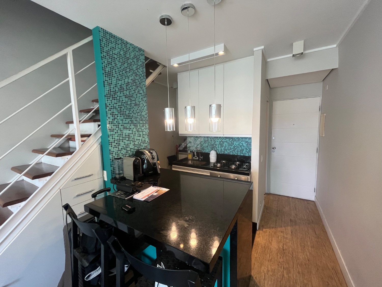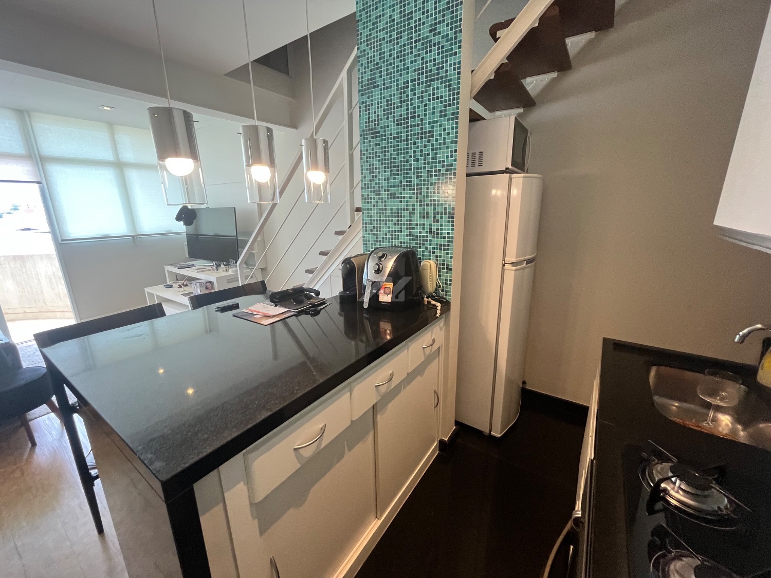 Localizado em andar alto, o imóvel é muito silencioso, bem iluminado e arejado. No piso inferior, conta com sala ampla com sacada, cozinha americana completa, lavabo e área de serviço.