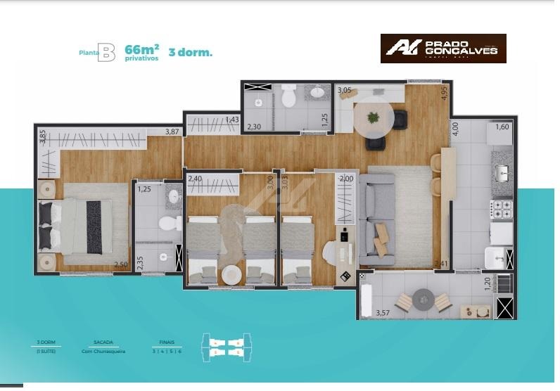 Planta Inteligente: 66m² privativos muito bem distribuídos.
