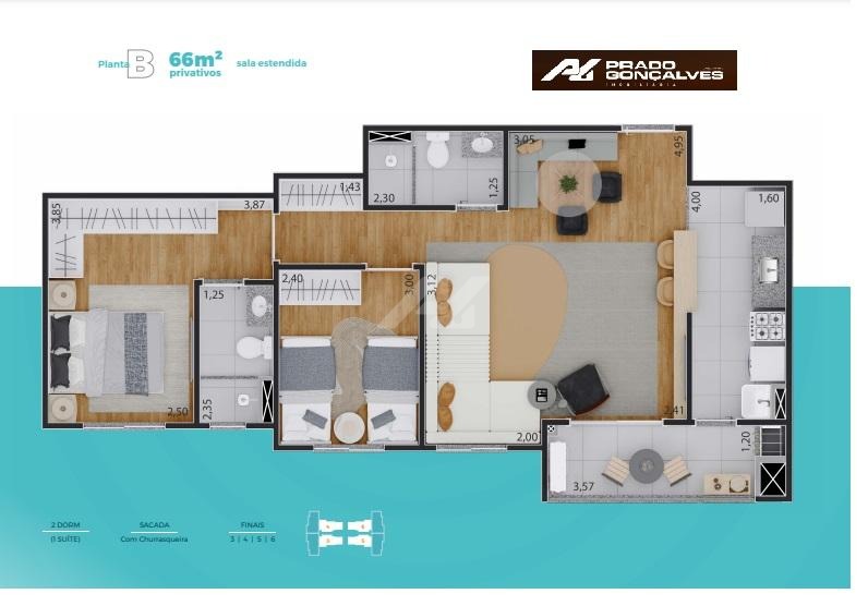 Flexibilidade: Opções de 2 quartos (1 suíte + sala ampliada) ou 3 quartos (1 suíte).