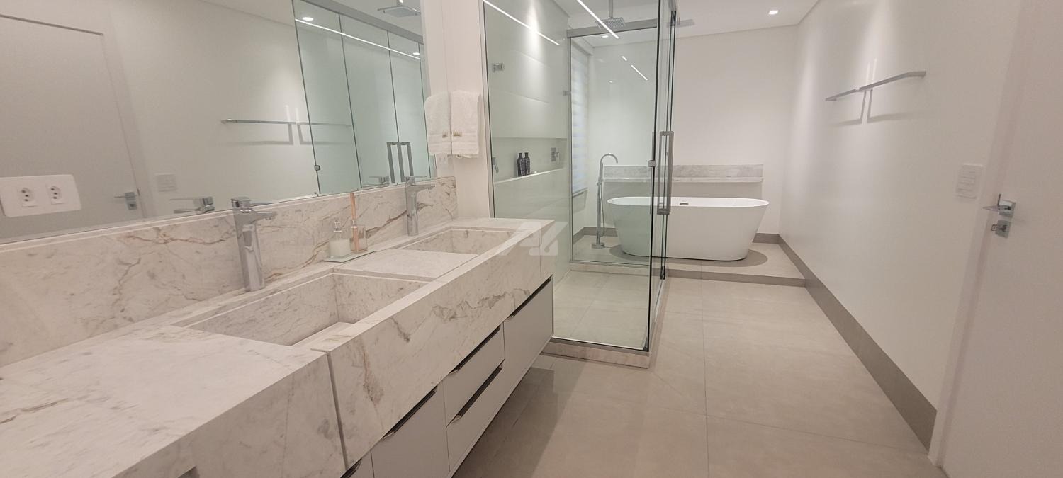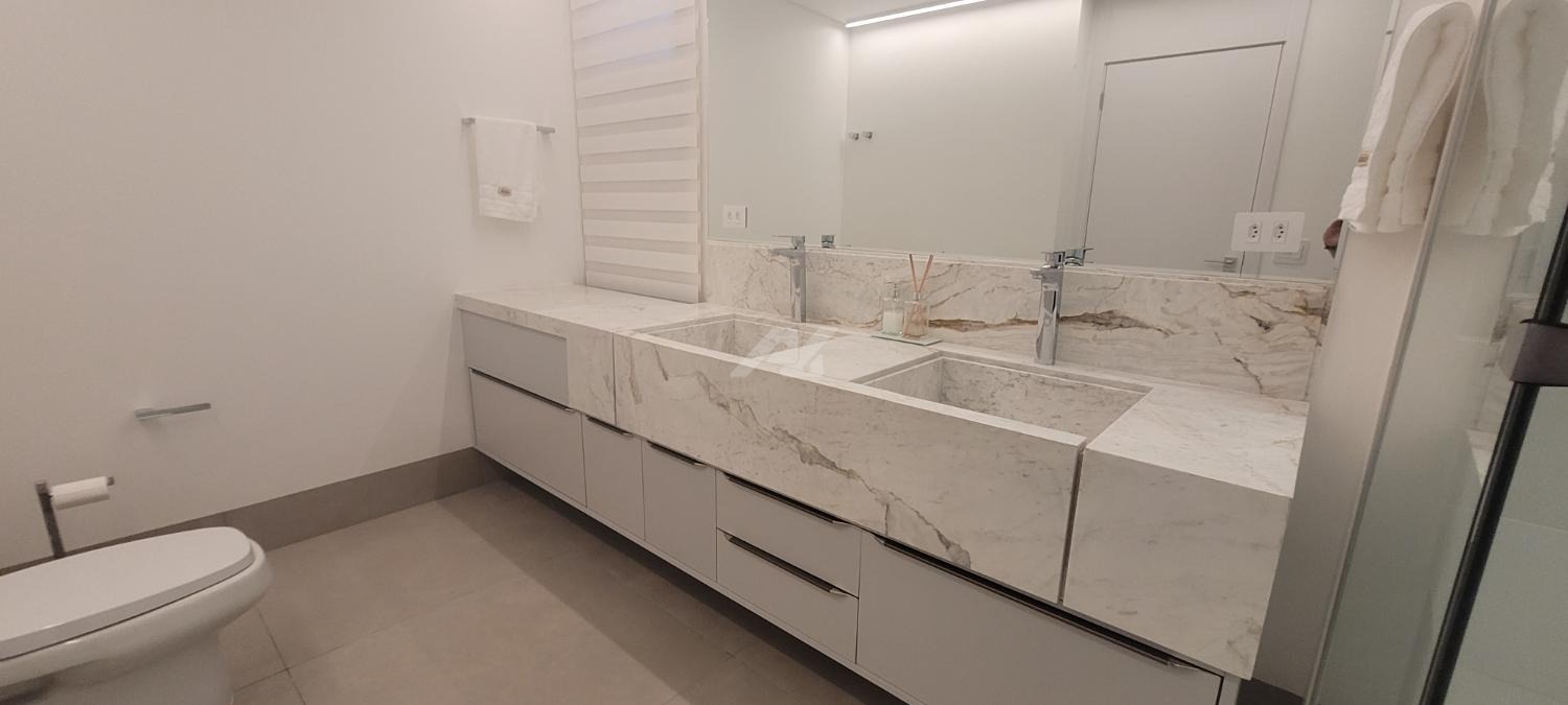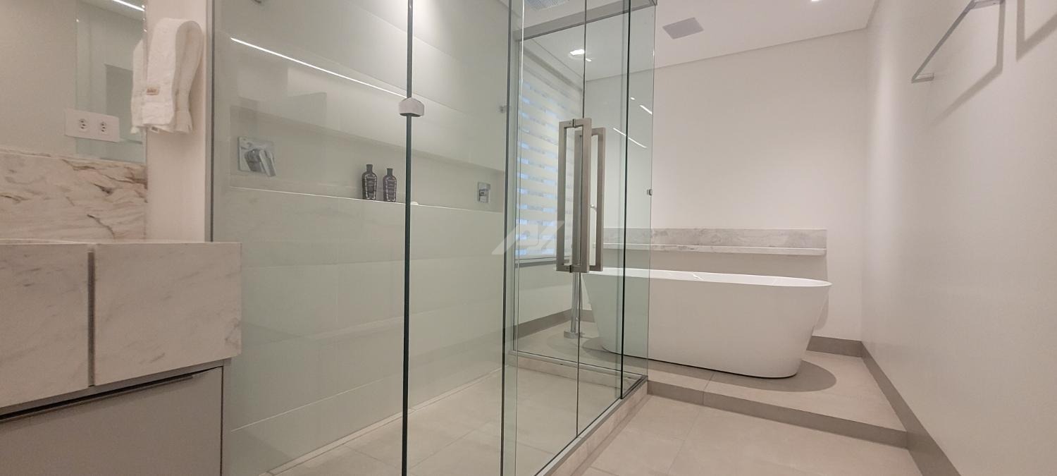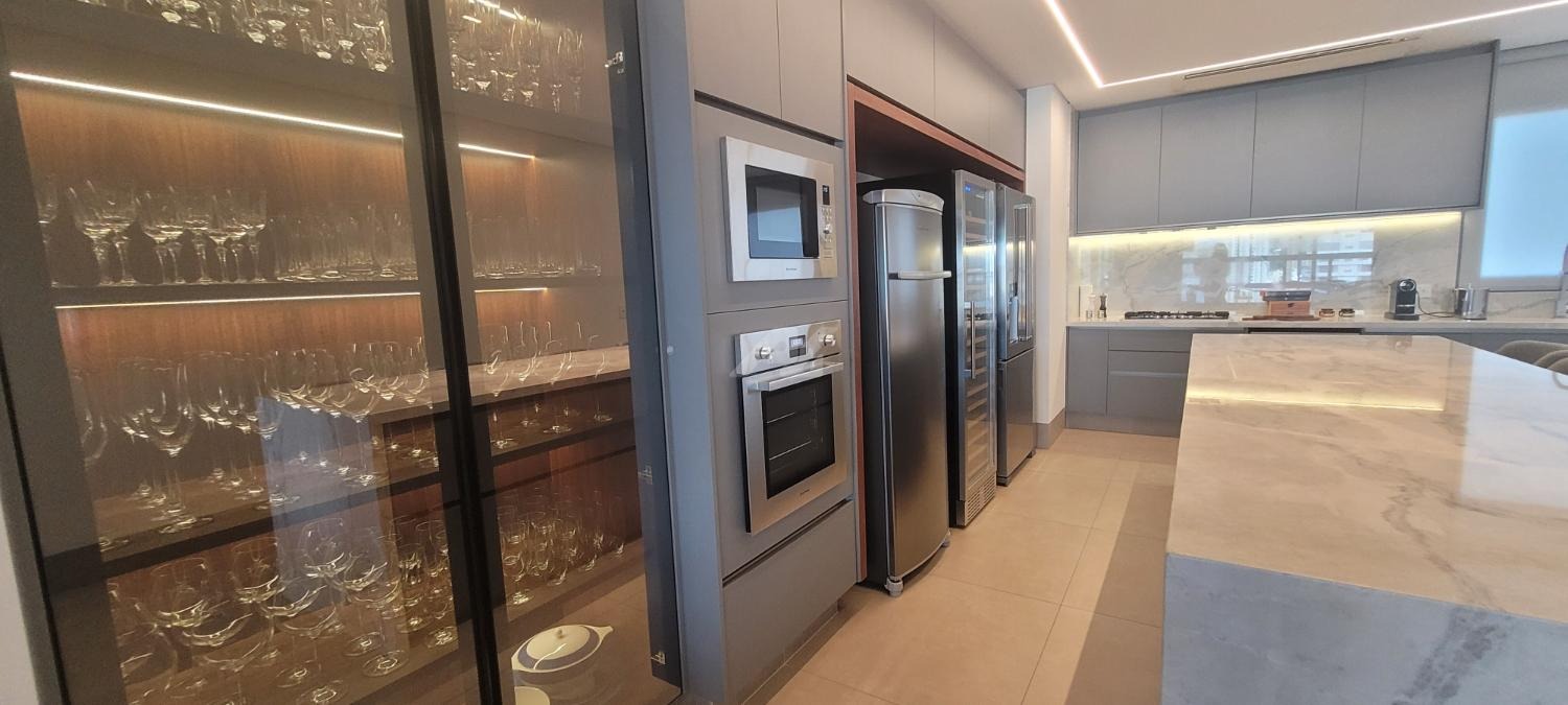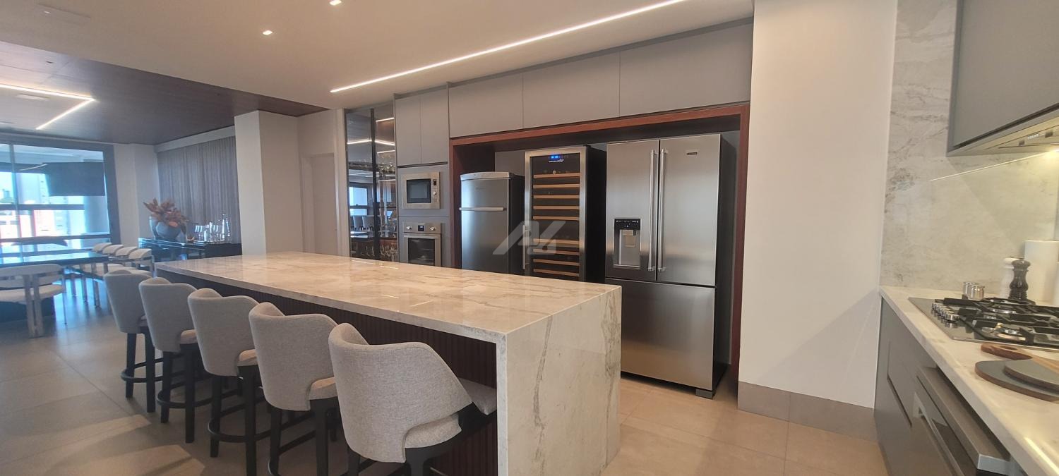A sala de estar e jantar apresenta layout moderno e funcional, ideal para receber convidados com requinte. A cozinha é equipada com bancadas em materiais nobres, marcenaria planejada e eletrodomésticos de última geração. As suítes proporcionam privacidade e aconchego, com closets espaçosos e banheiros revestidos com acabamentos premium, metais de design e iluminação estratégica.