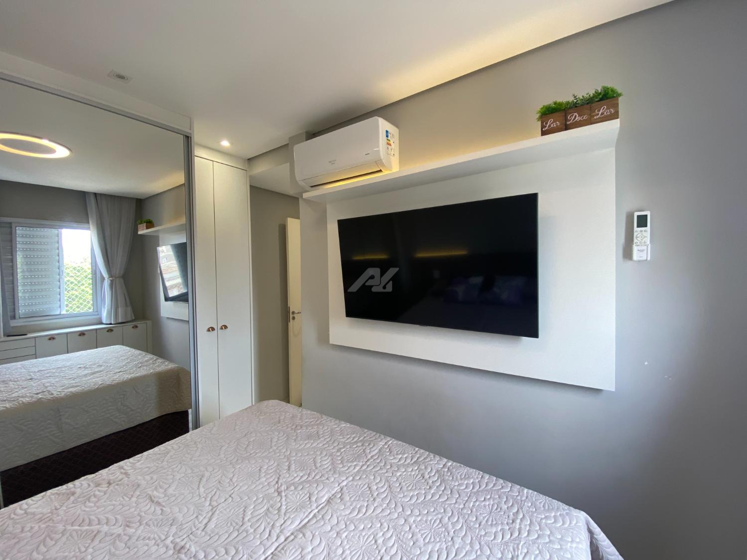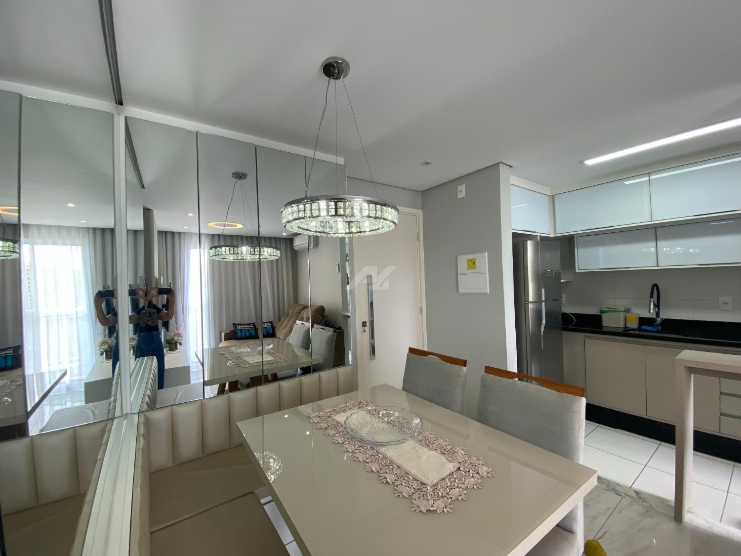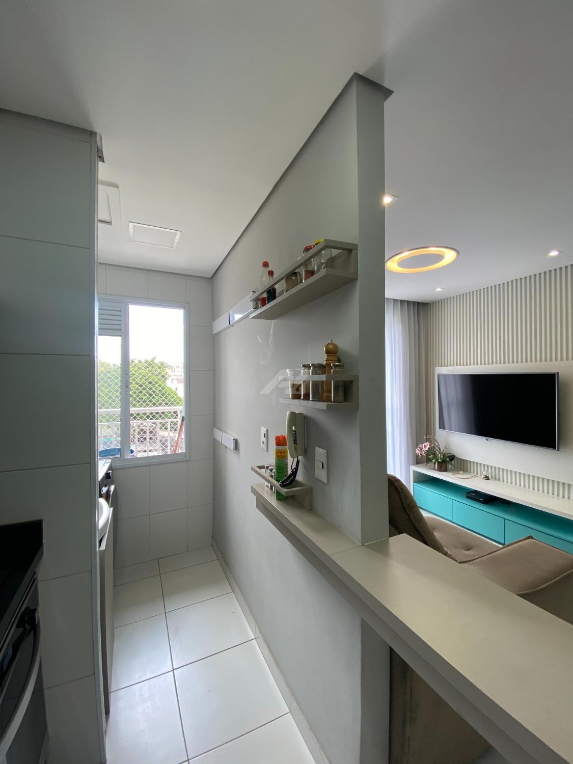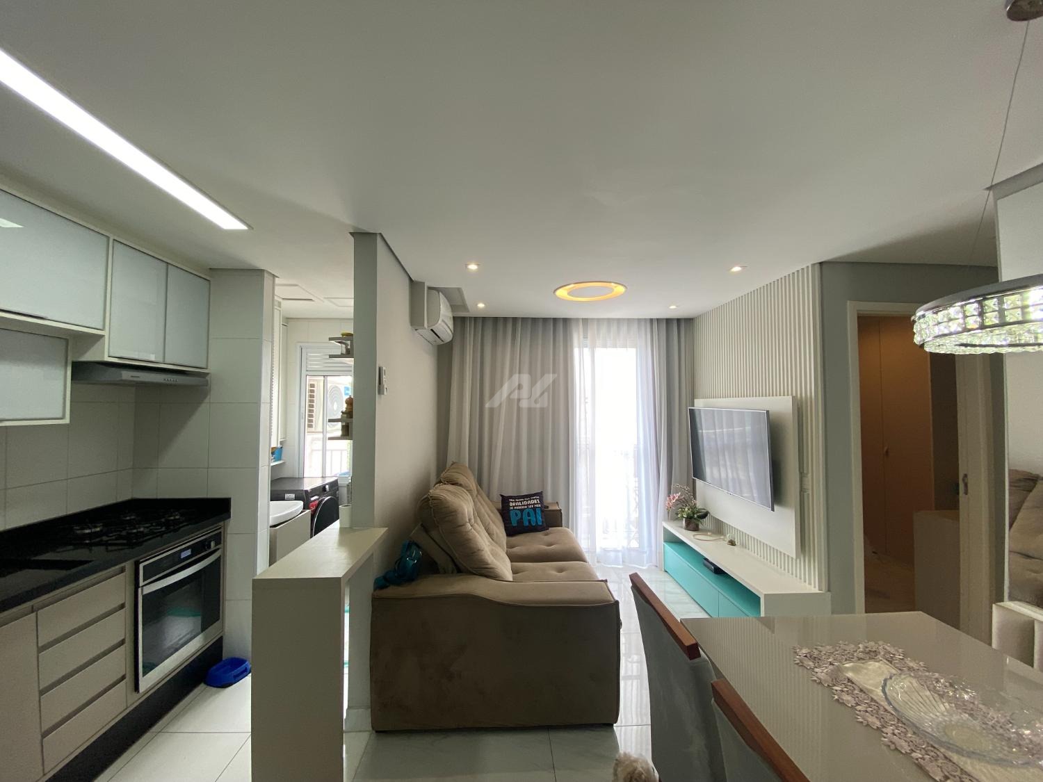 Apartamento em andar intermediário, com 2 quartos, salas com ambientes claros e ventilados, cozinha americana, acabamentos modernos, ar condicionado na salas e quarto.
