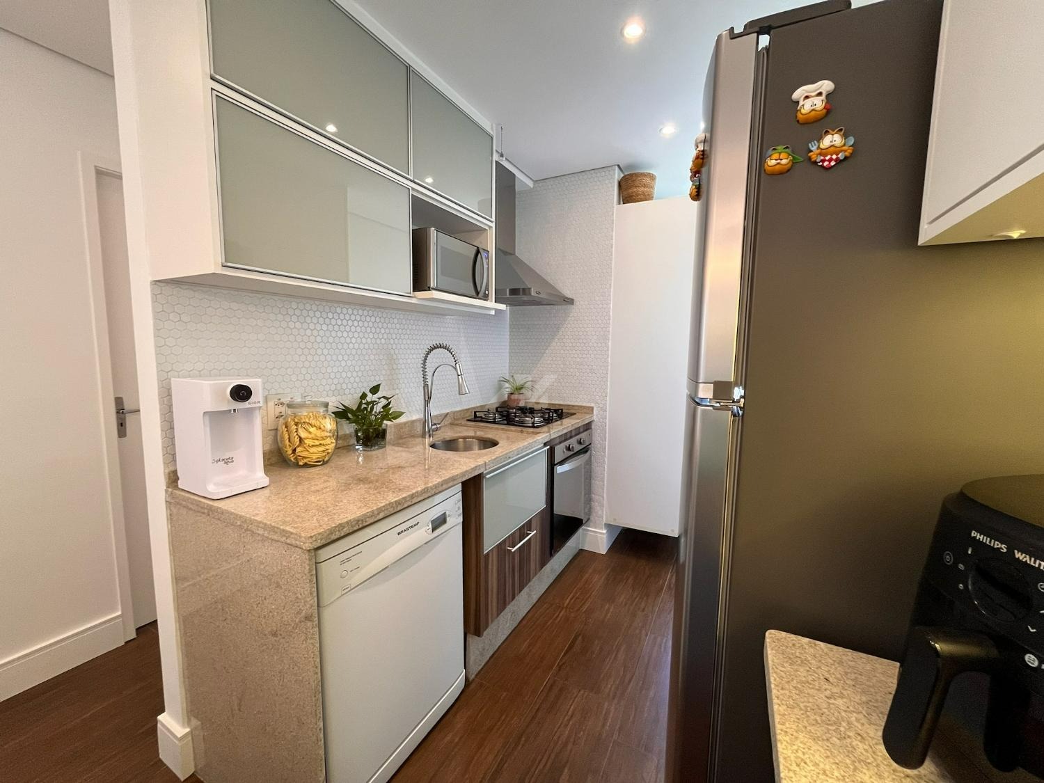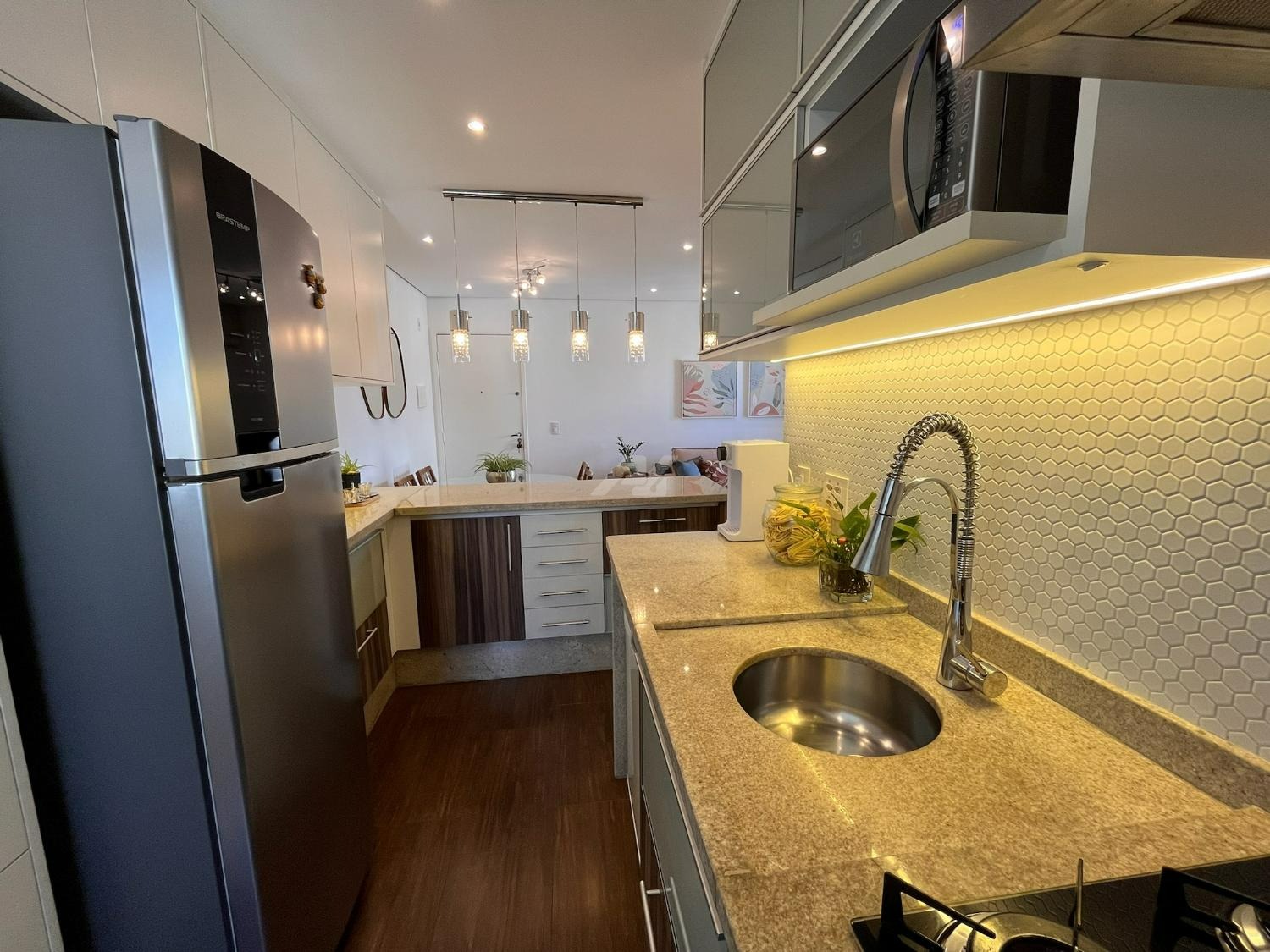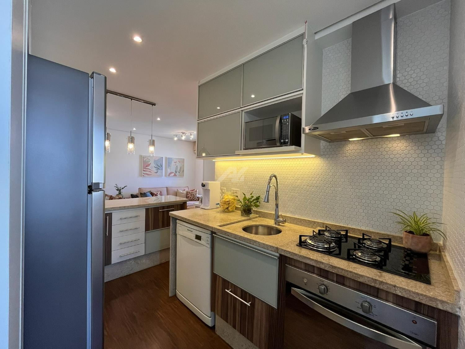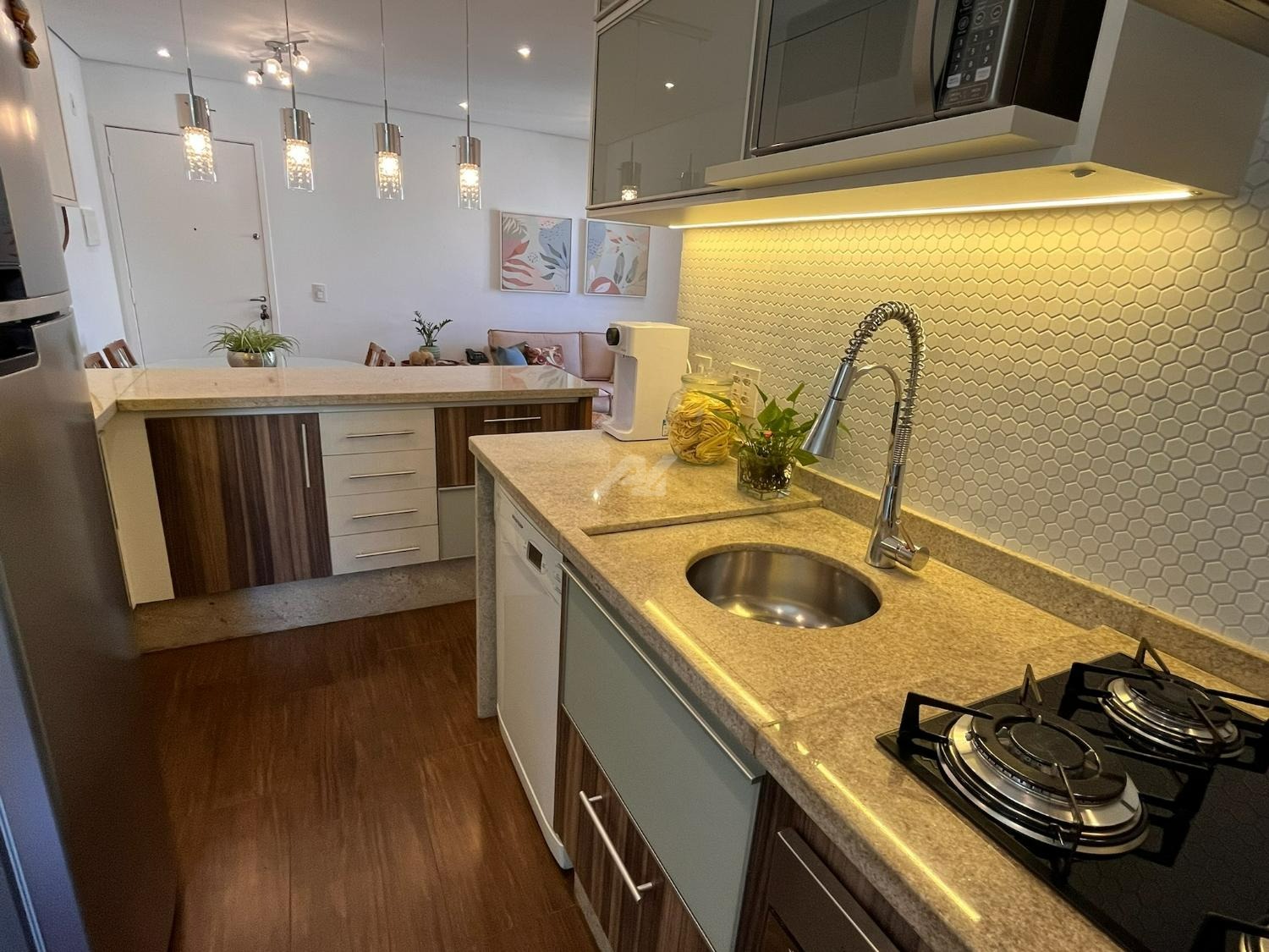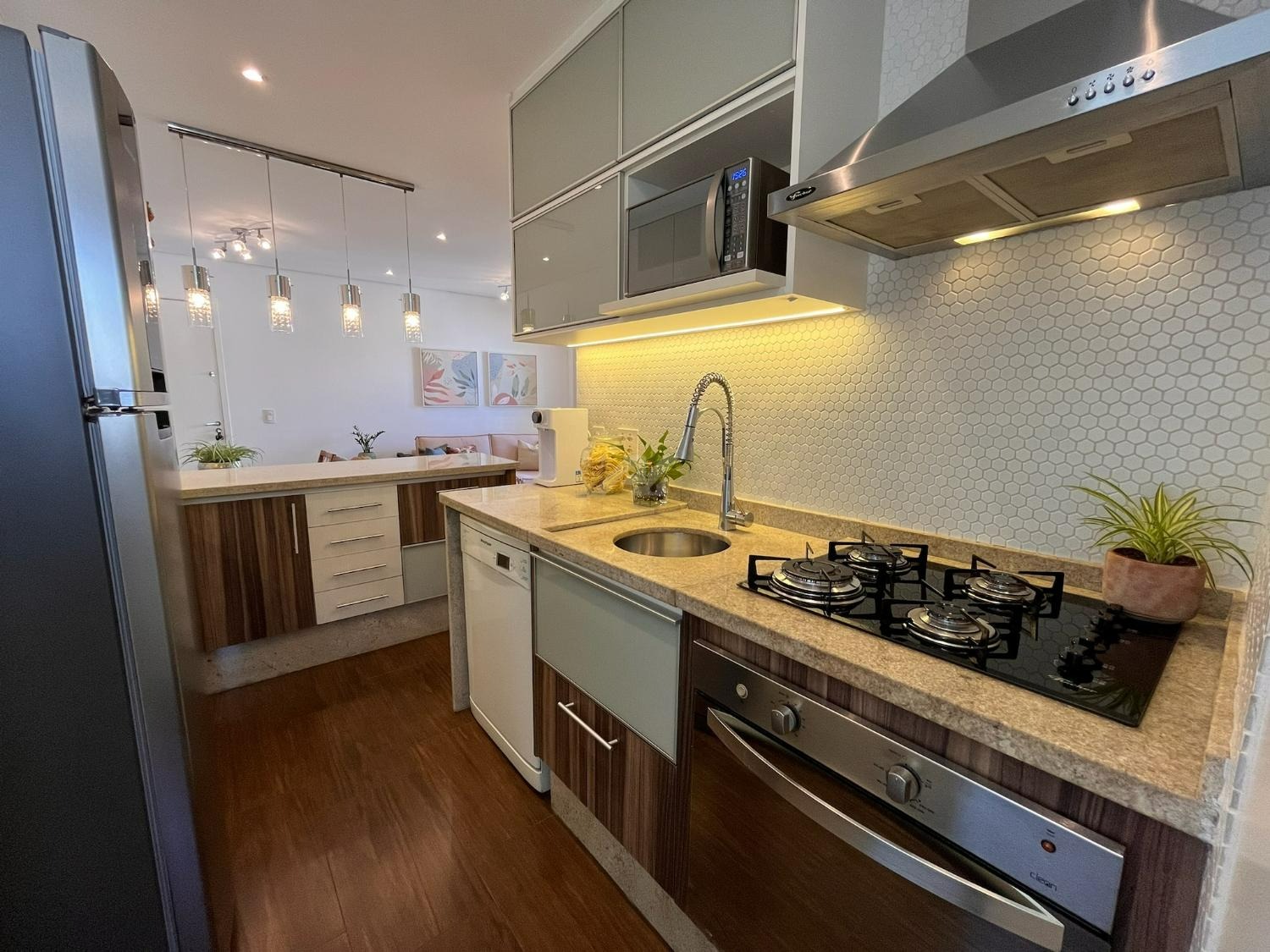 A cozinha foi cuidadosamente planejada, apresentando acabamento moderno e funcional, com armários novos em tom branco, iluminação em LED embutida, revestimento em pastilhas Atlas com efeito colmeia, coifa em aço inox, cooktop e forno a gás embutidos, além de infraestrutura completa para filtro de água e lava-louças. A integração com a sala valoriza o ambiente, que conta com móvel sob medida para TV, combinando elegância e praticidade em acabamento branco e madeira Cumaru.