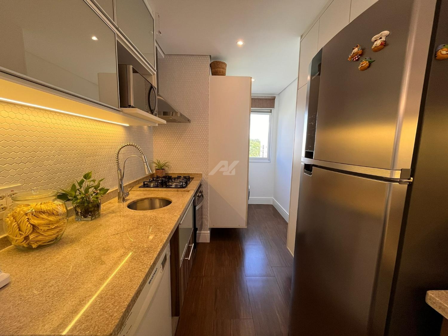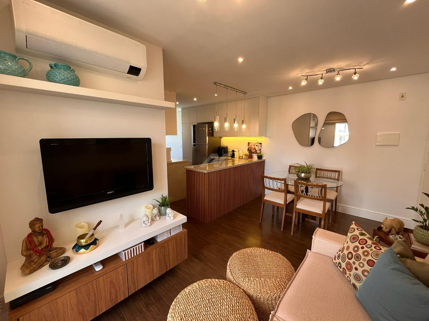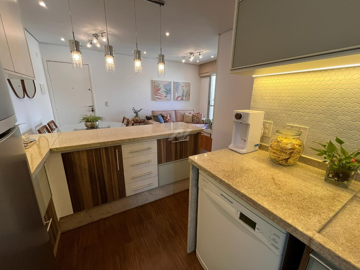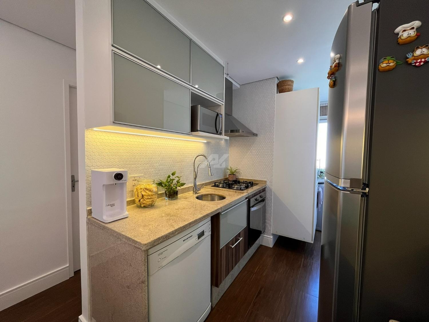 A cozinha foi cuidadosamente planejada, apresentando acabamento moderno e funcional, com armários novos em tom branco, iluminação em LED embutida, revestimento em pastilhas Atlas com efeito colmeia, coifa em aço inox, cooktop e forno a gás embutidos, além de infraestrutura completa para filtro de água e lava-louças. A integração com a sala valoriza o ambiente, que conta com móvel sob medida para TV, combinando elegância e praticidade em acabamento branco e madeira Cumaru.