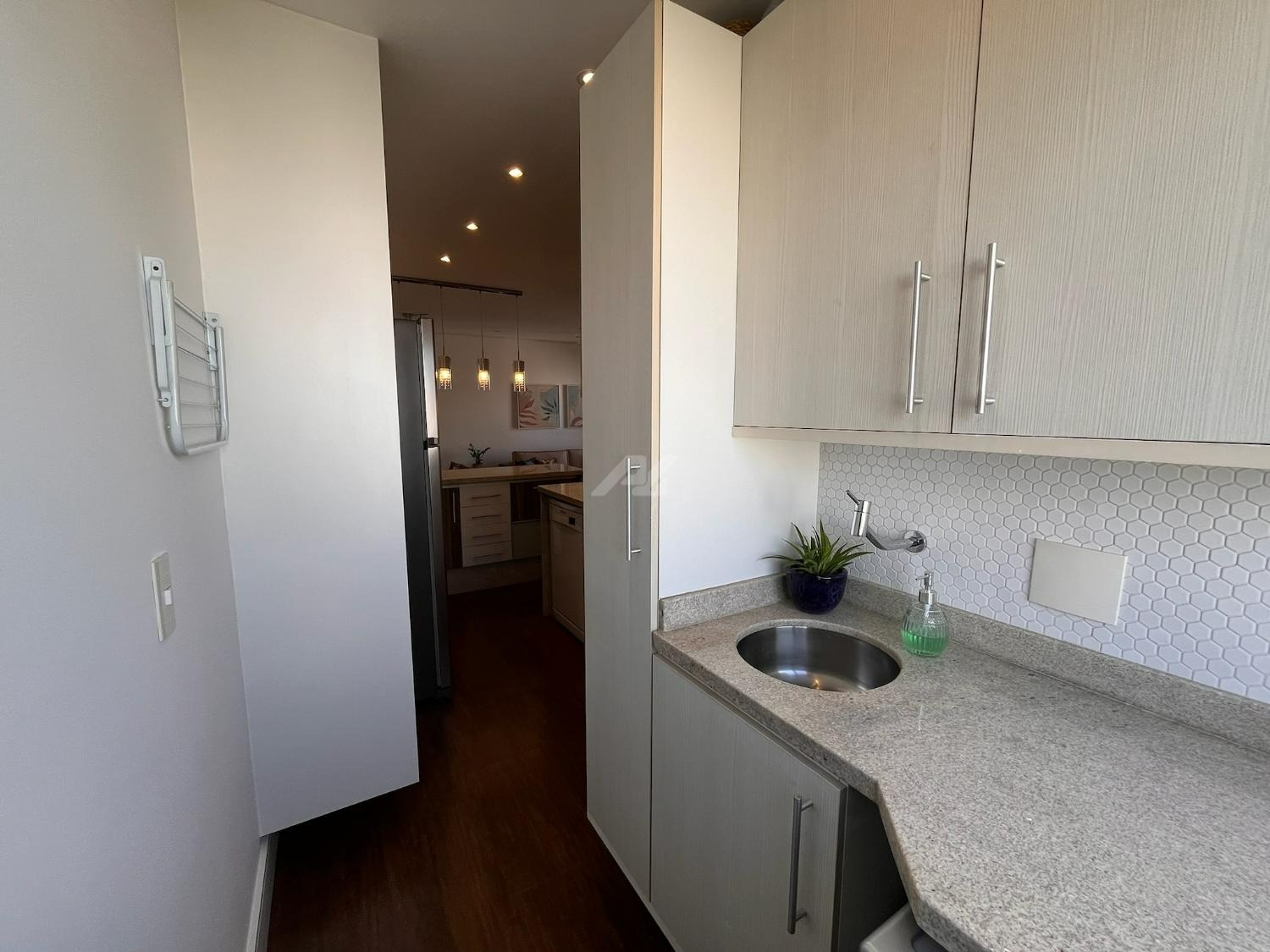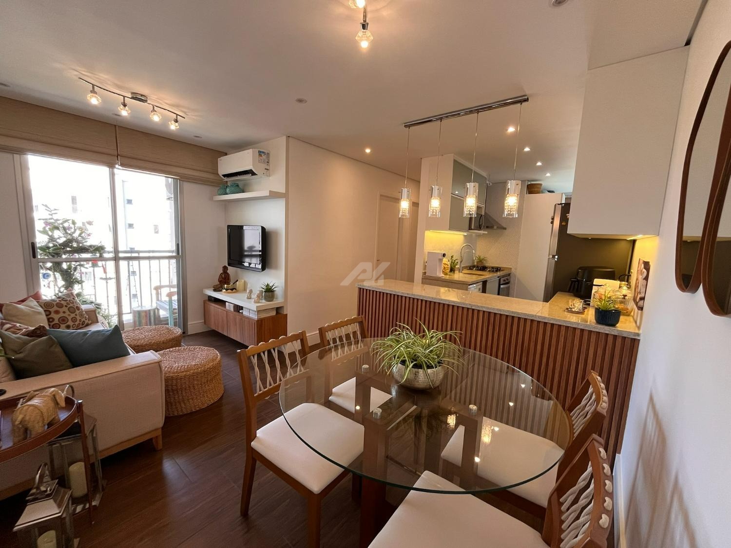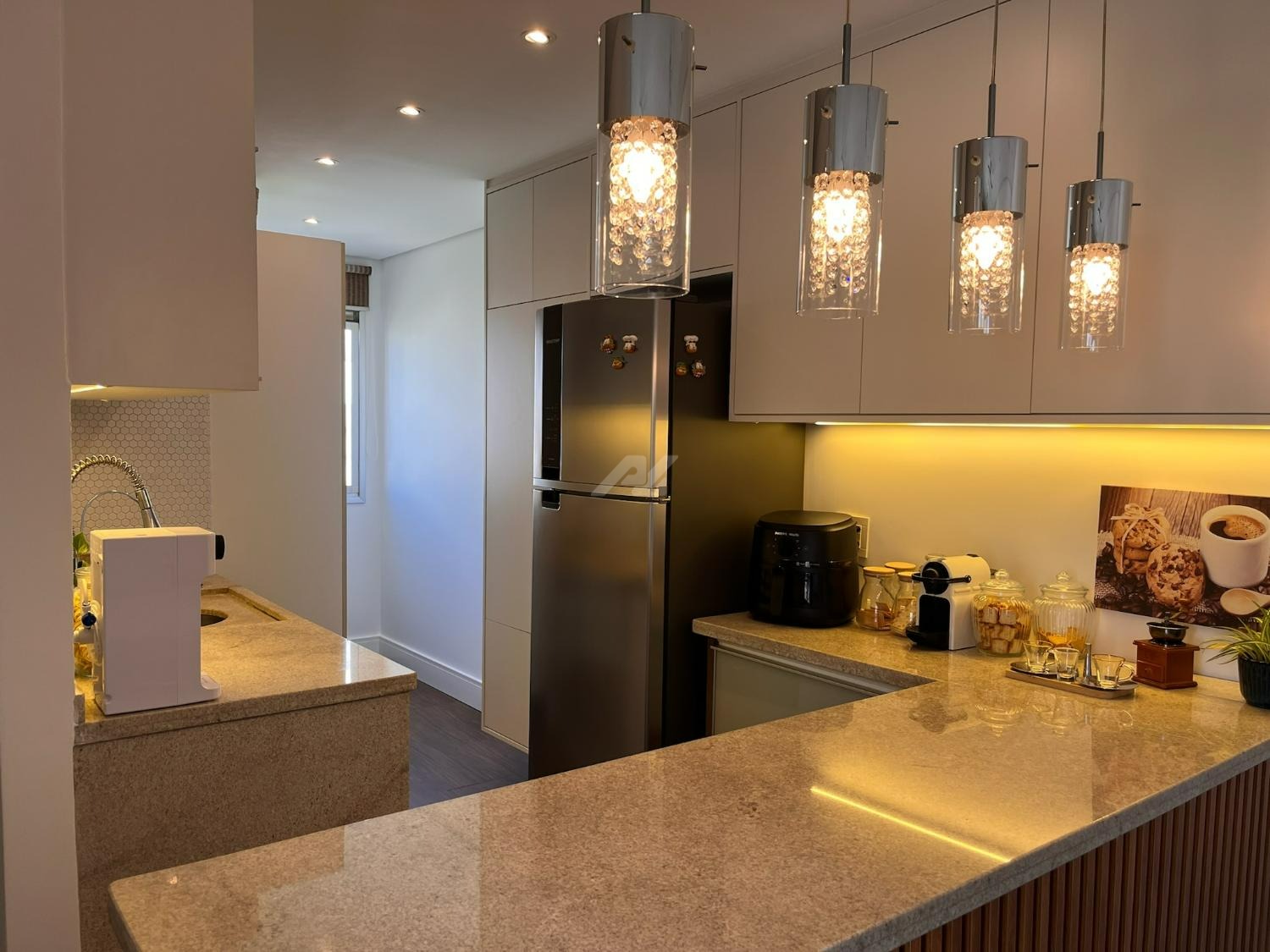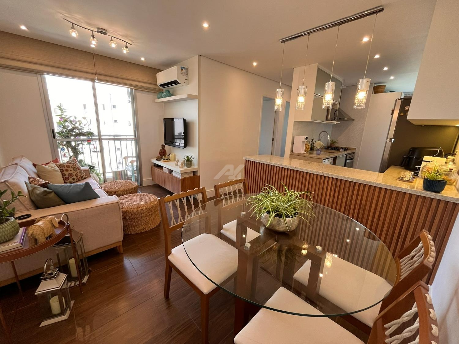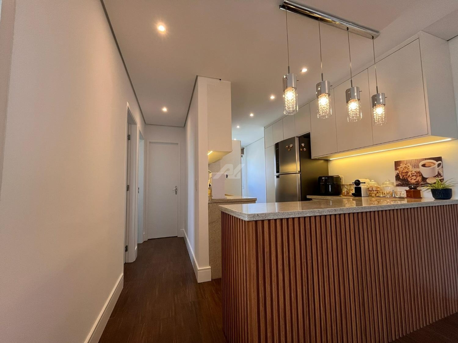 A cozinha foi cuidadosamente planejada, apresentando acabamento moderno e funcional, com armários novos em tom branco, iluminação em LED embutida, revestimento em pastilhas Atlas com efeito colmeia, coifa em aço inox, cooktop e forno a gás embutidos, além de infraestrutura completa para filtro de água e lava-louças. A integração com a sala valoriza o ambiente, que conta com móvel sob medida para TV, combinando elegância e praticidade em acabamento branco e madeira Cumaru.