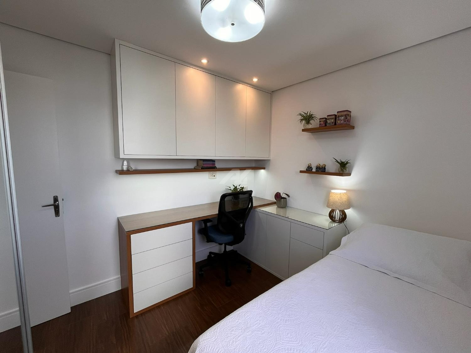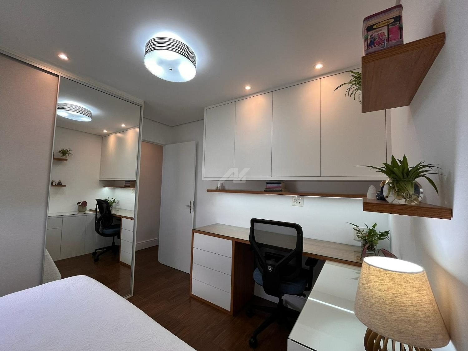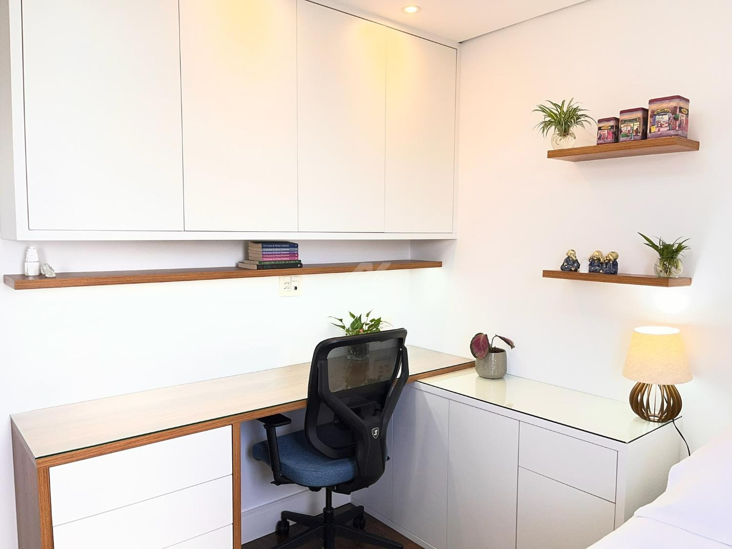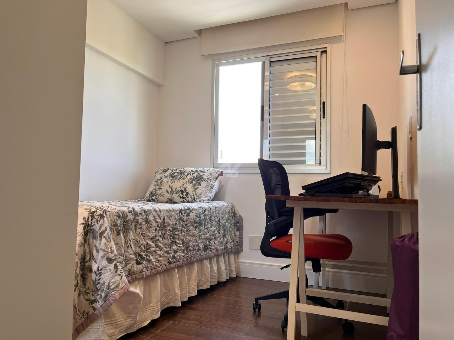 O imóvel dispõe de sistema de ar-condicionado Samsung quente e frio, com tecnologia Wind Free, garantindo conforto térmico em todas as estações. Os dormitórios possuem móveis planejados de excelente qualidade, com portas de correr, amplos espaços de armazenamento e ótimo aproveitamento interno. O dormitório principal ainda oferece um espaço dedicado para home office, com design funcional e acabamento sofisticado, podendo ser facilmente adaptado conforme a necessidade do novo proprietário.