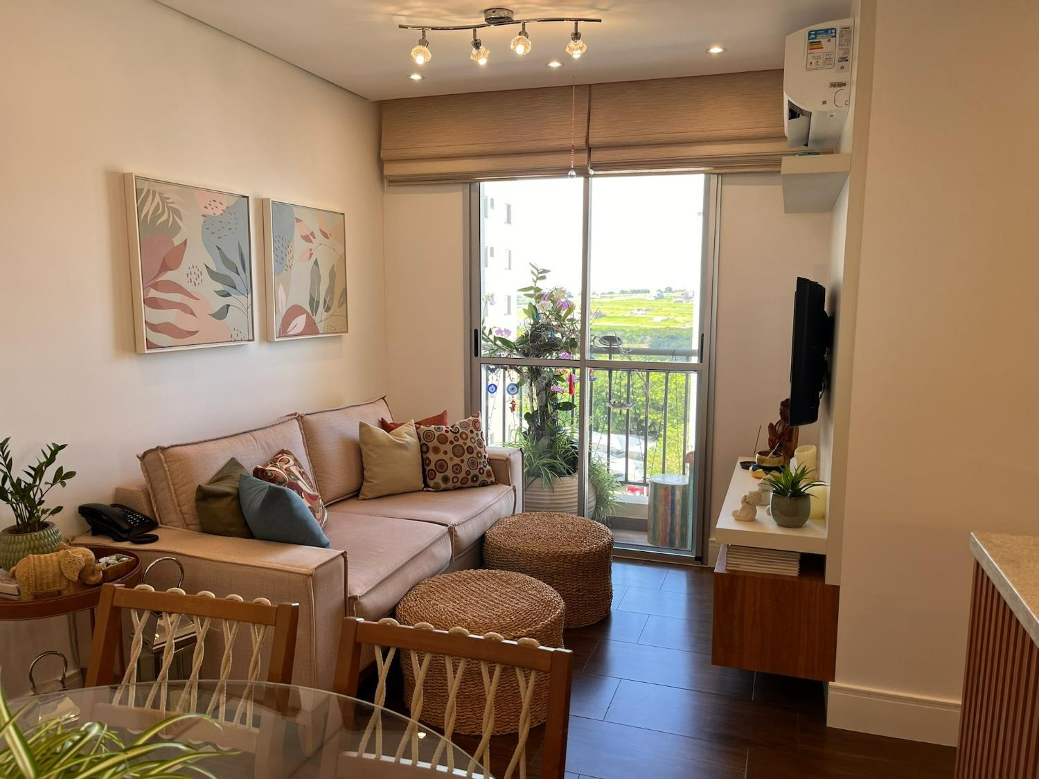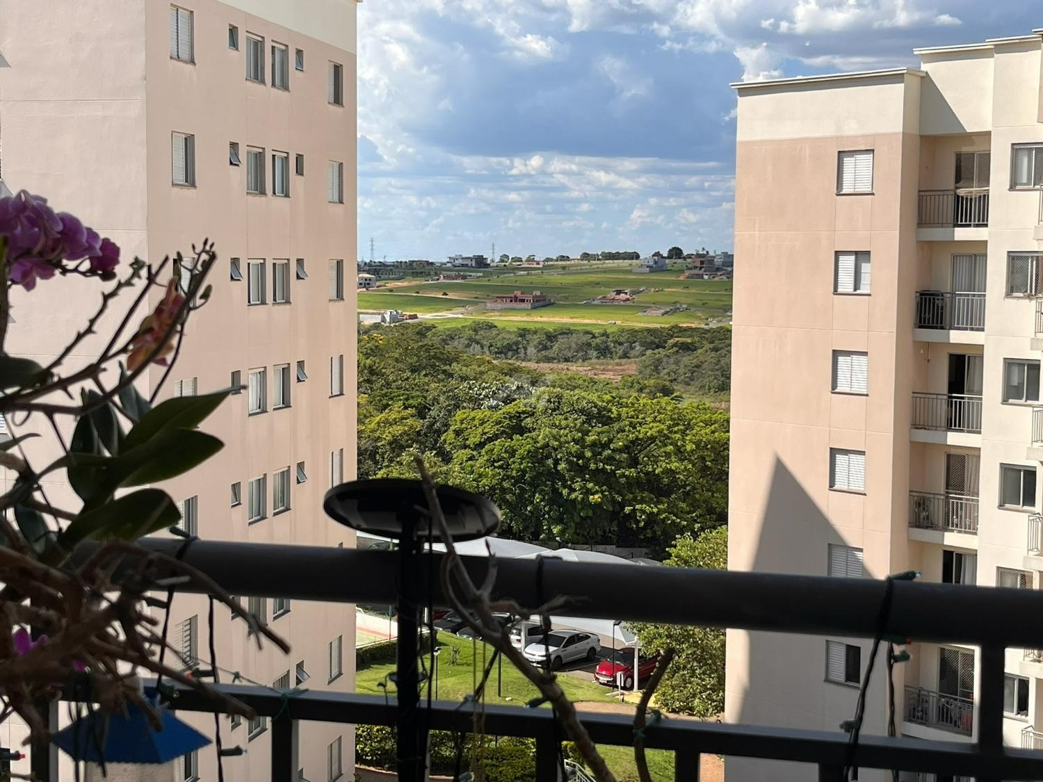 Com ótima iluminação e ventilação natural, o apartamento conta com dois dormitórios, banheiro, sala de estar e jantar integradas, cozinha americana e lavanderia. Posicionado na face nordeste, recebe o agradável sol da manhã e mantém luminosidade abundante ao longo do dia, além de ventilação cruzada eficiente, tornando os ambientes mais frescos e agradáveis. A vista para área verde e a proximidade com uma fazenda garantem uma atmosfera silenciosa e acolhedora, com presença constante de vegetação e o canto dos pássaros.