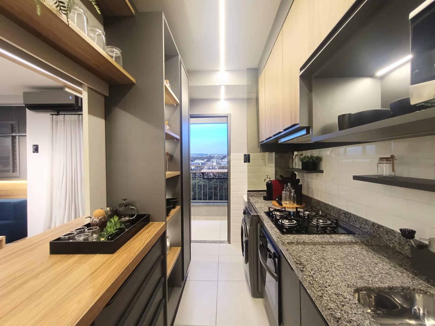 A sala para 2 ambientes, sacada com churrasqueira a carvão com acesso também pela cozinha que é americana.