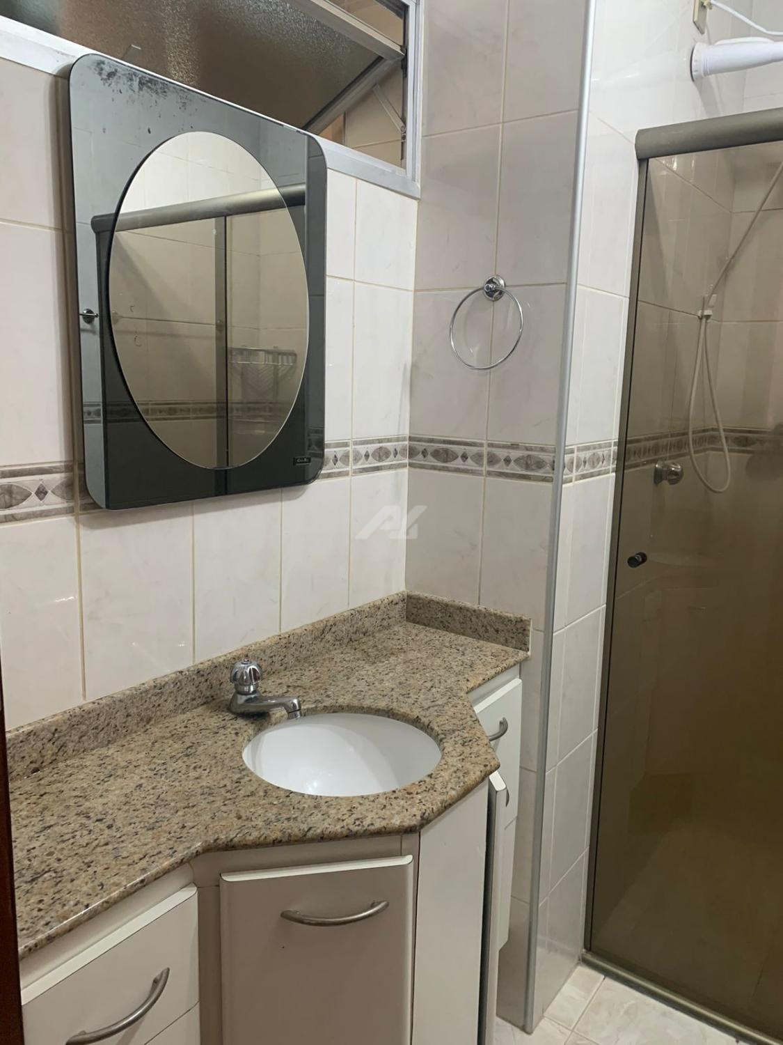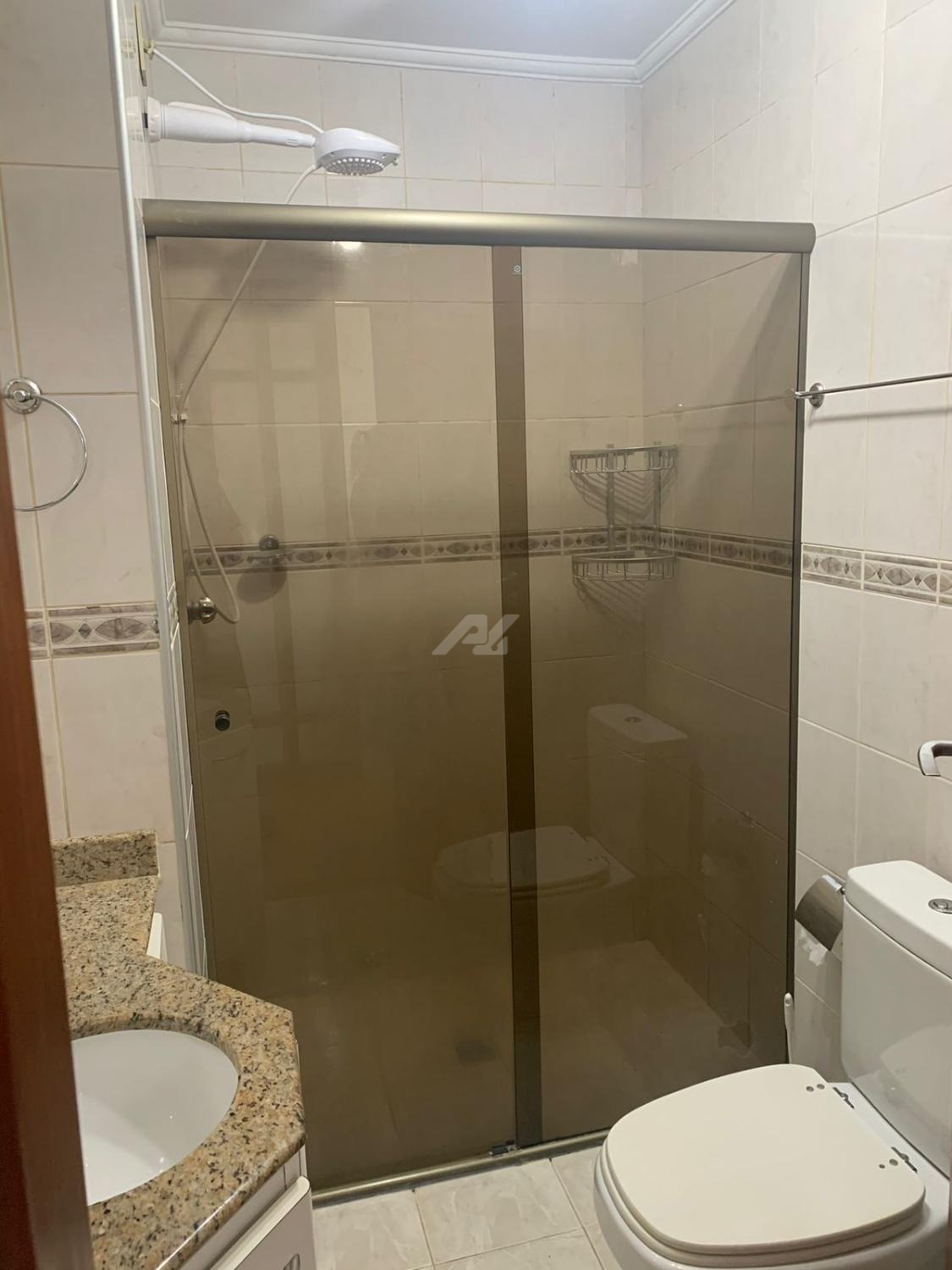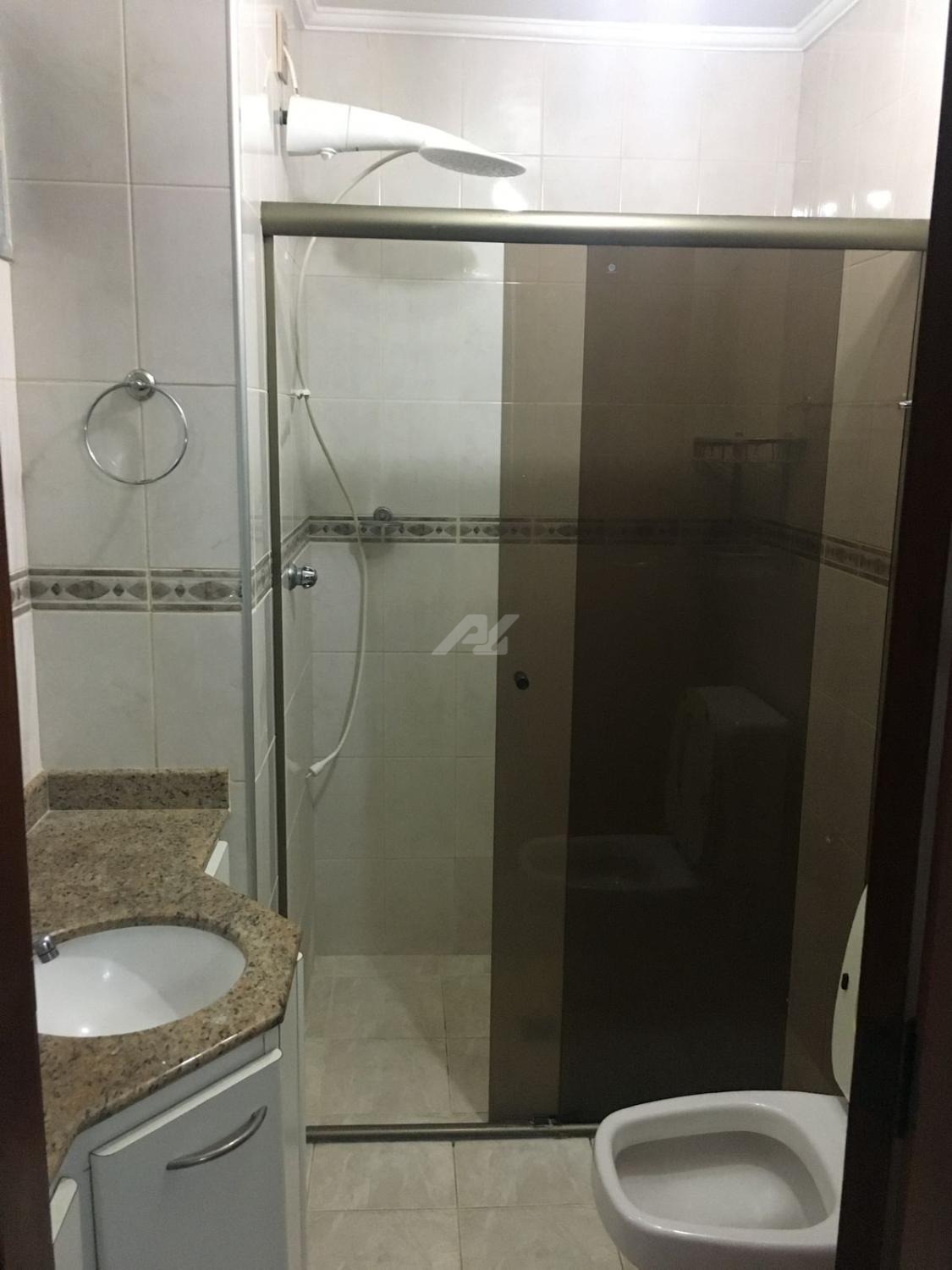 Banheiro - armários, box em vidro temperado, e ducha elétrica.