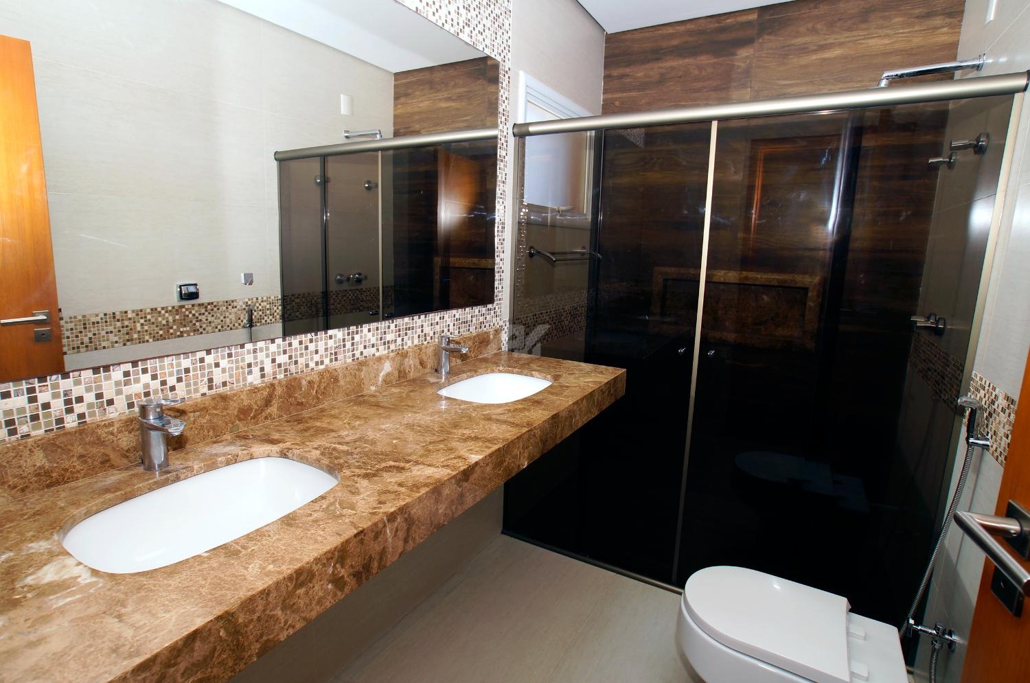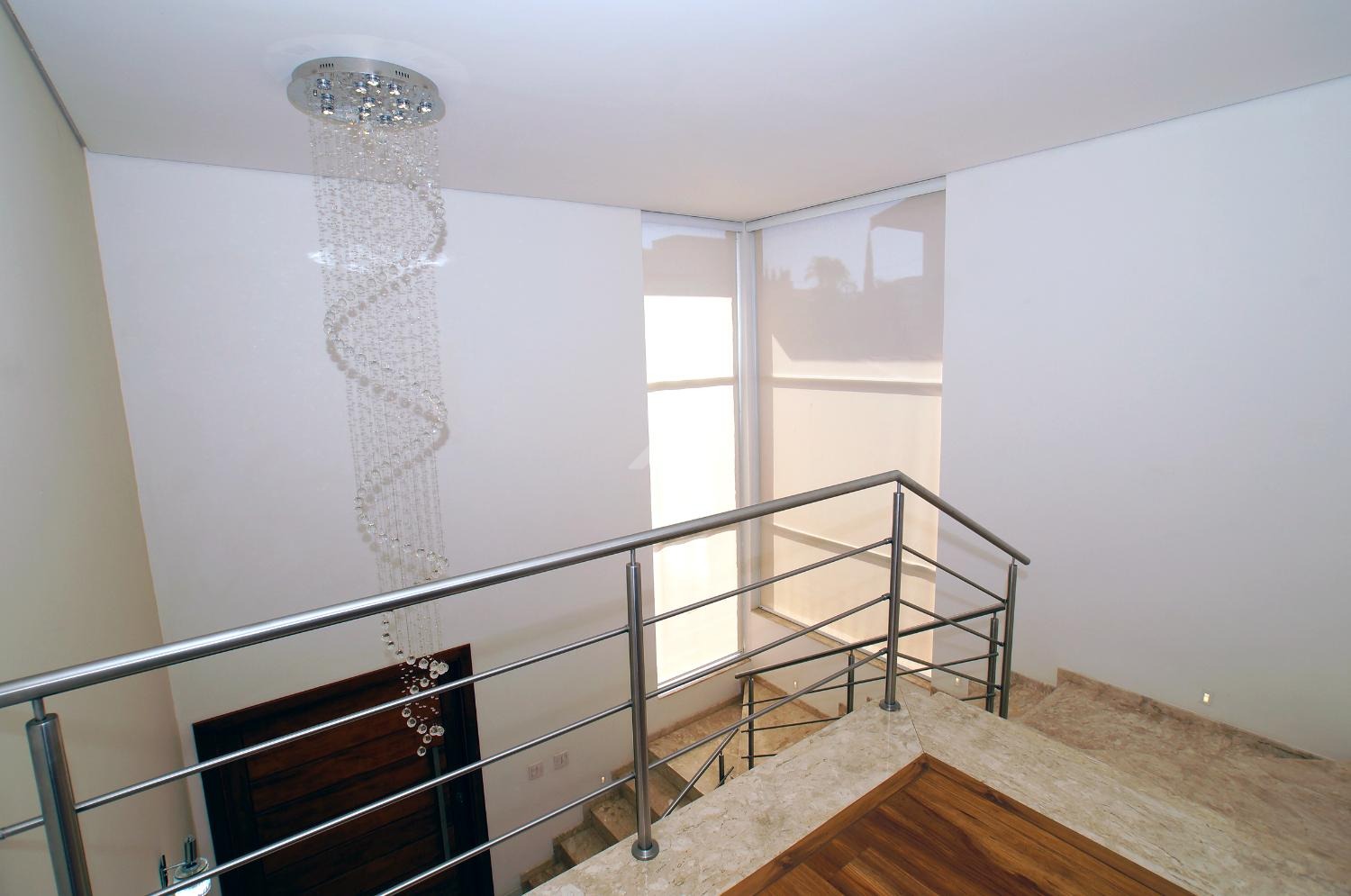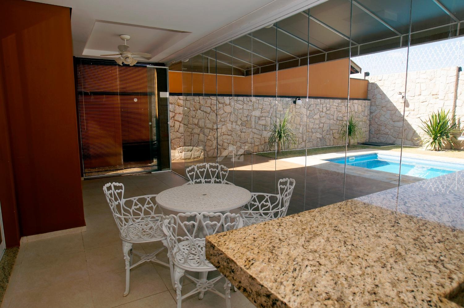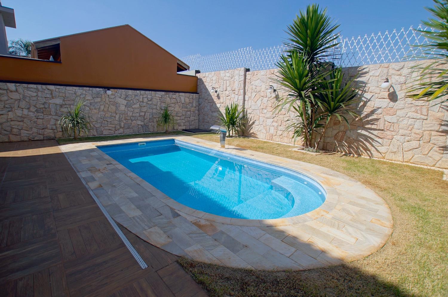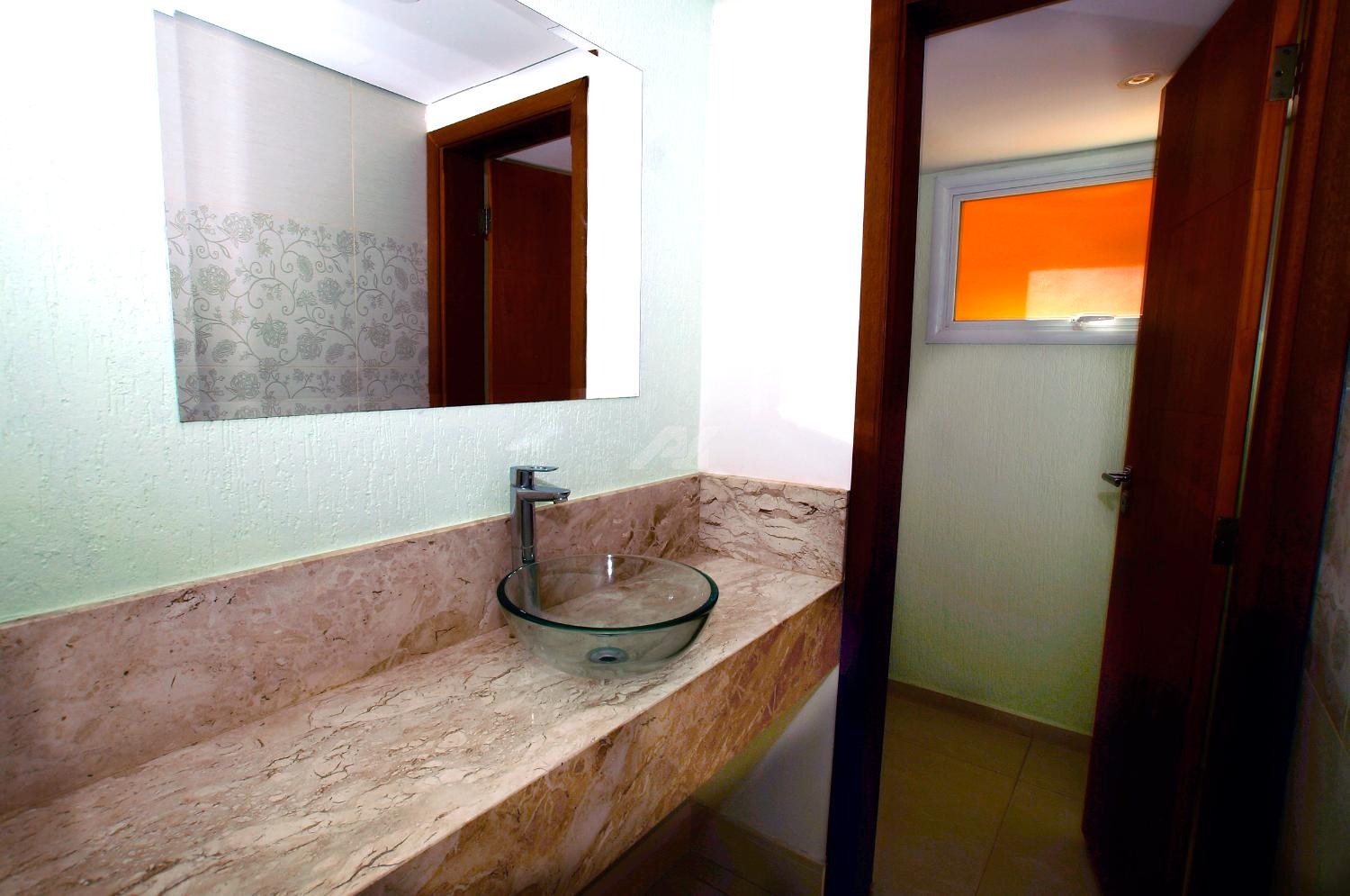 O pavimento térreo possui sala ampla e iluminada para três ambientes, lavabo, sala de tv, área gourmet fechada com vidros temperados, piscina, vestiário, escritório, cozinha, despensa e área de serviço.