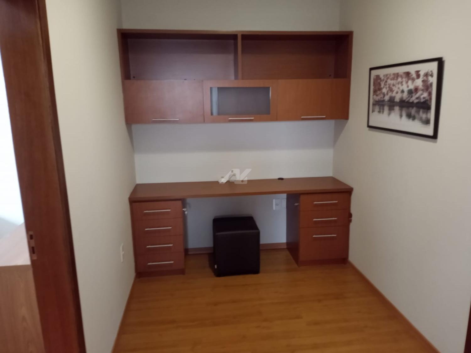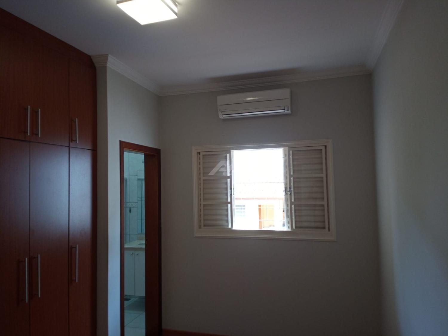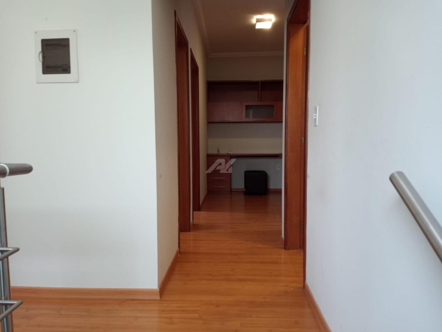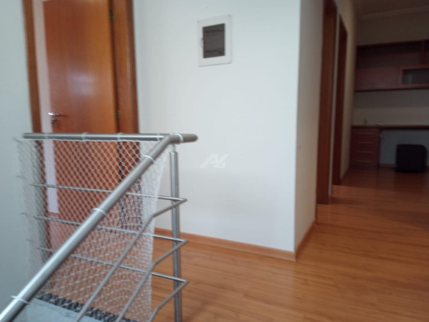 Piso superior com espaço de home office, roupeiro, 4 quartos completos de armários, sendo 2 suítes, e a master com hidro, varanda e ar condicionado.