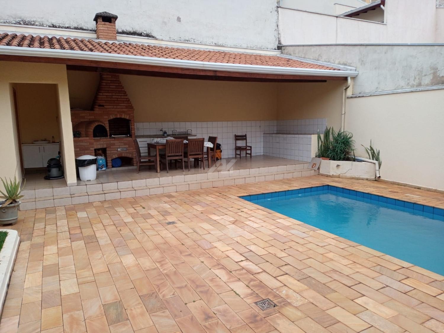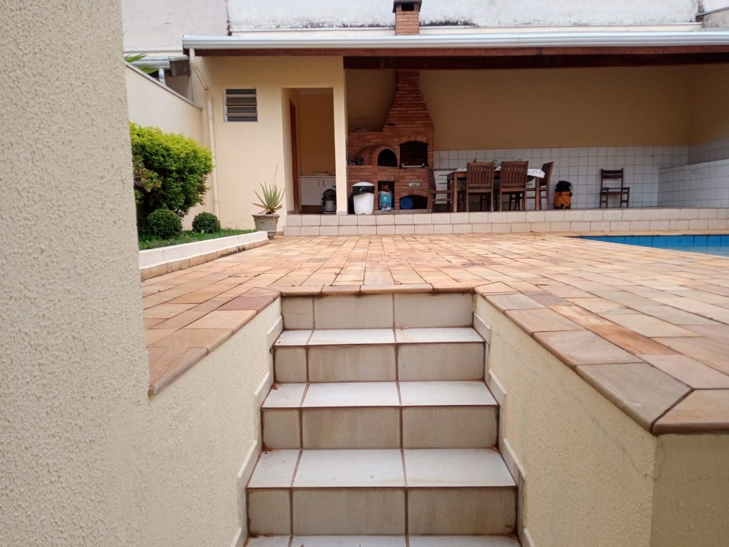 Área externa com churrasqueira, piscina, jardim, e garagem para 4 carros.