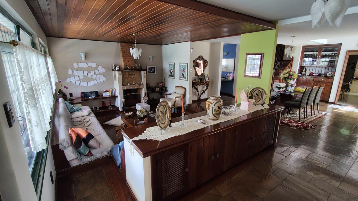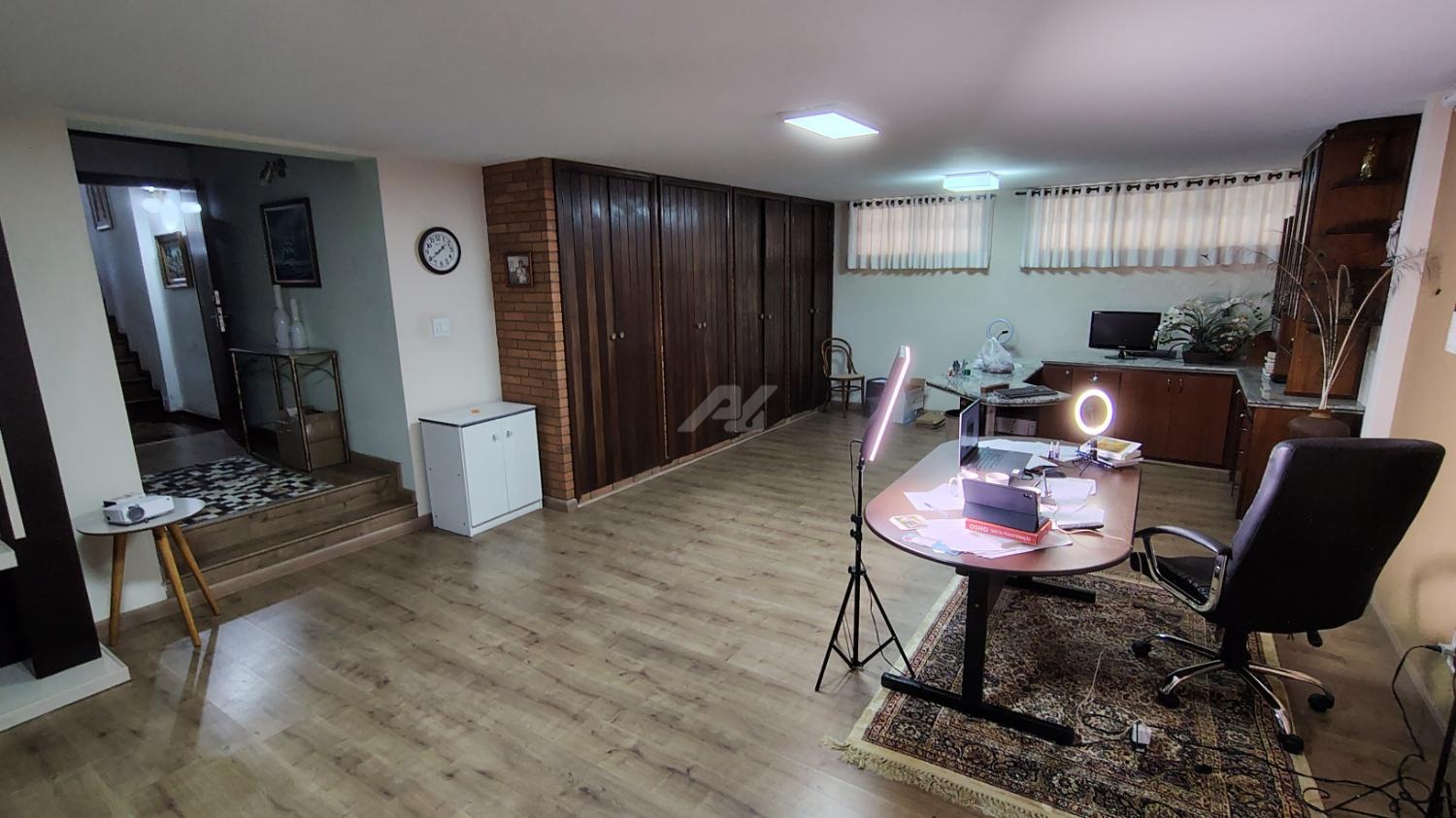 Sala Multifuncional: Piso inferior com lareira, armários e mesa embutida – perfeito para Home Office, Studio ou Sala de Reuniões.