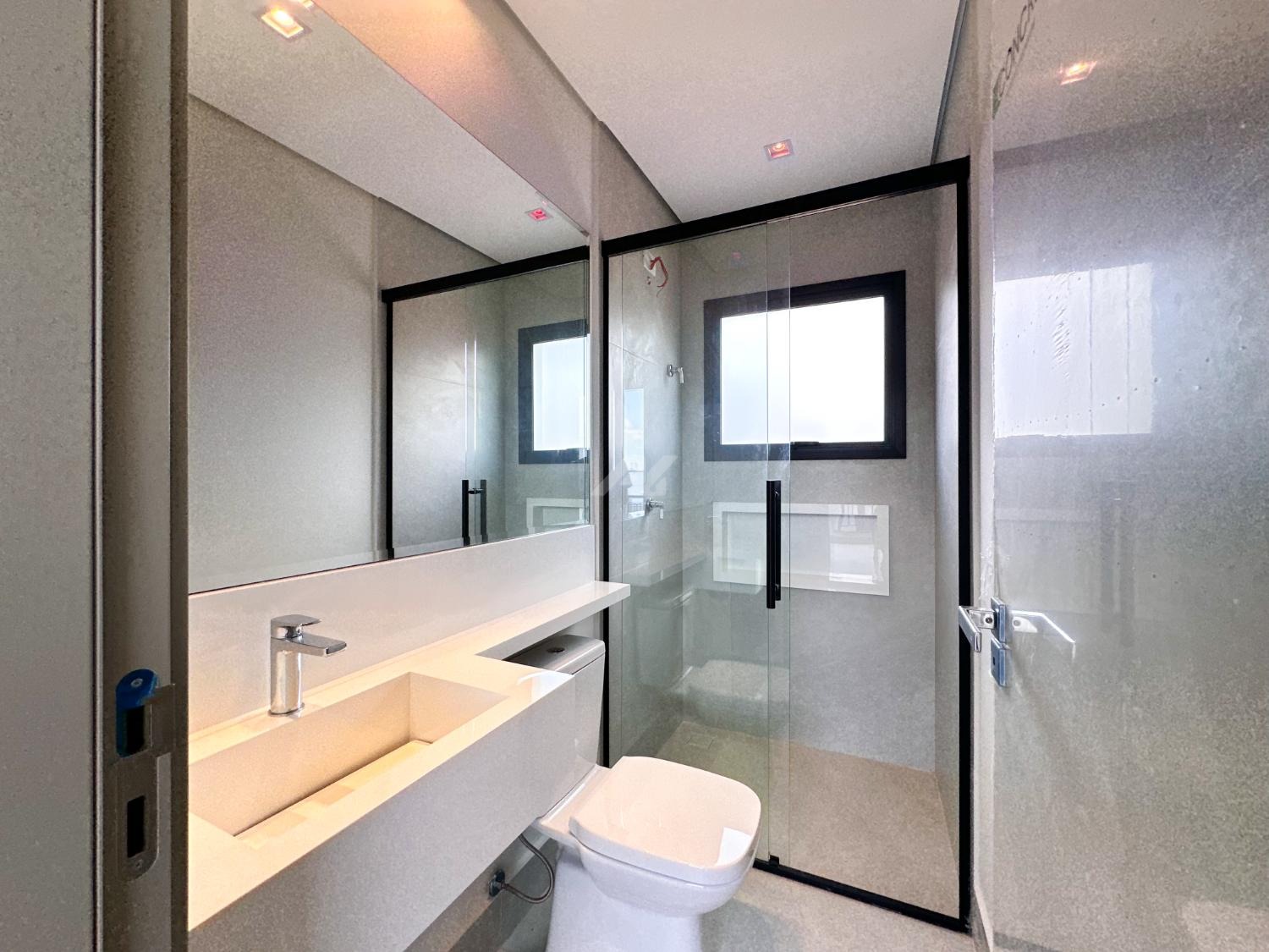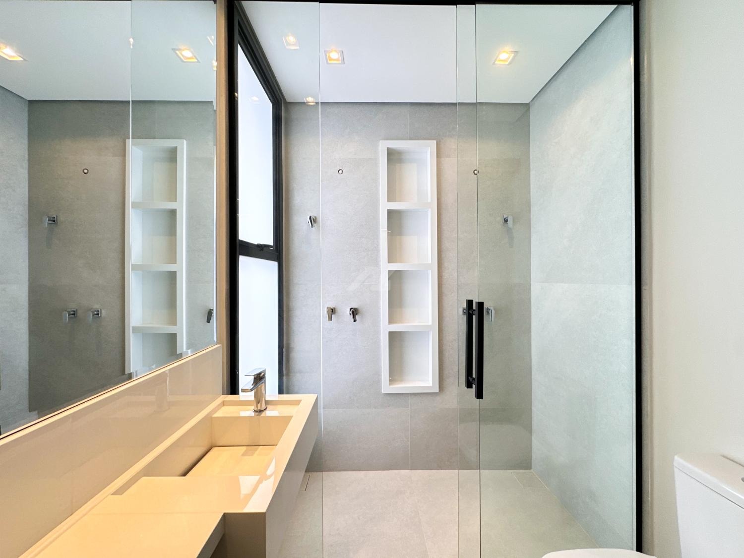 Box e espelhos instalados no banheiro da suíte master