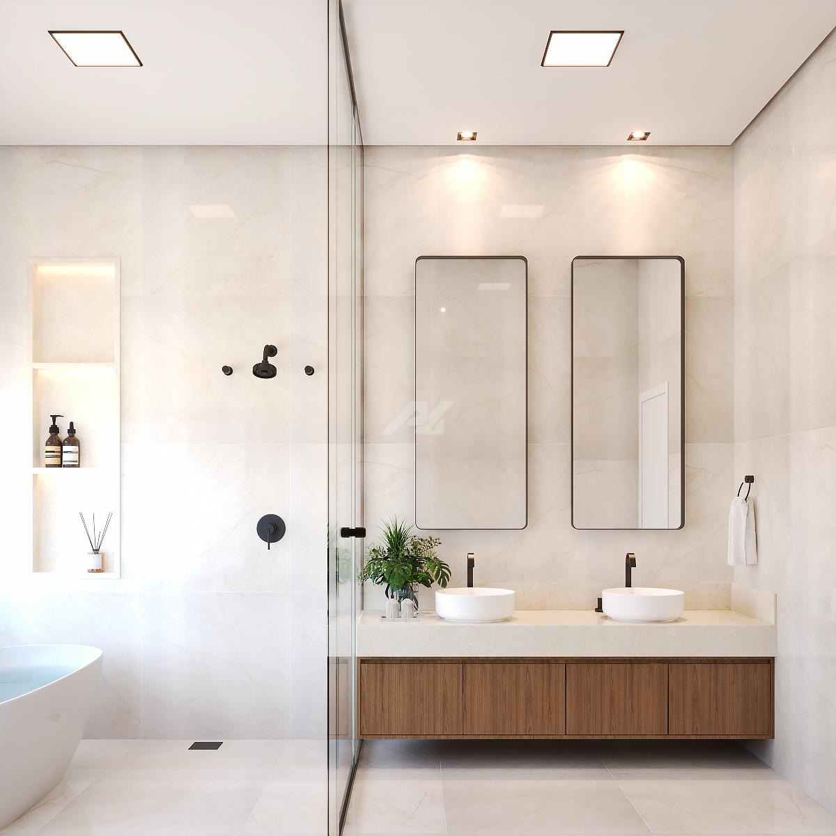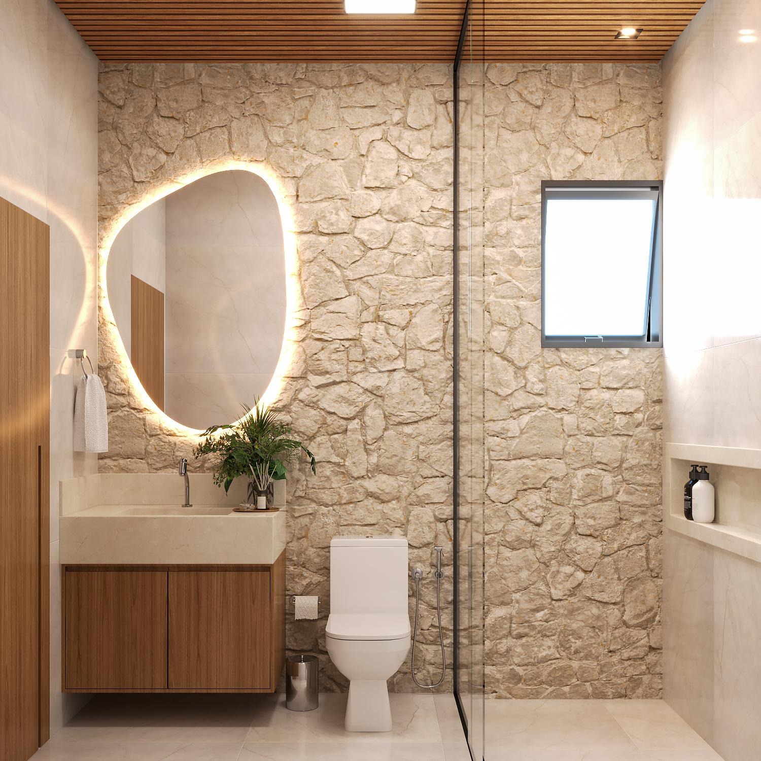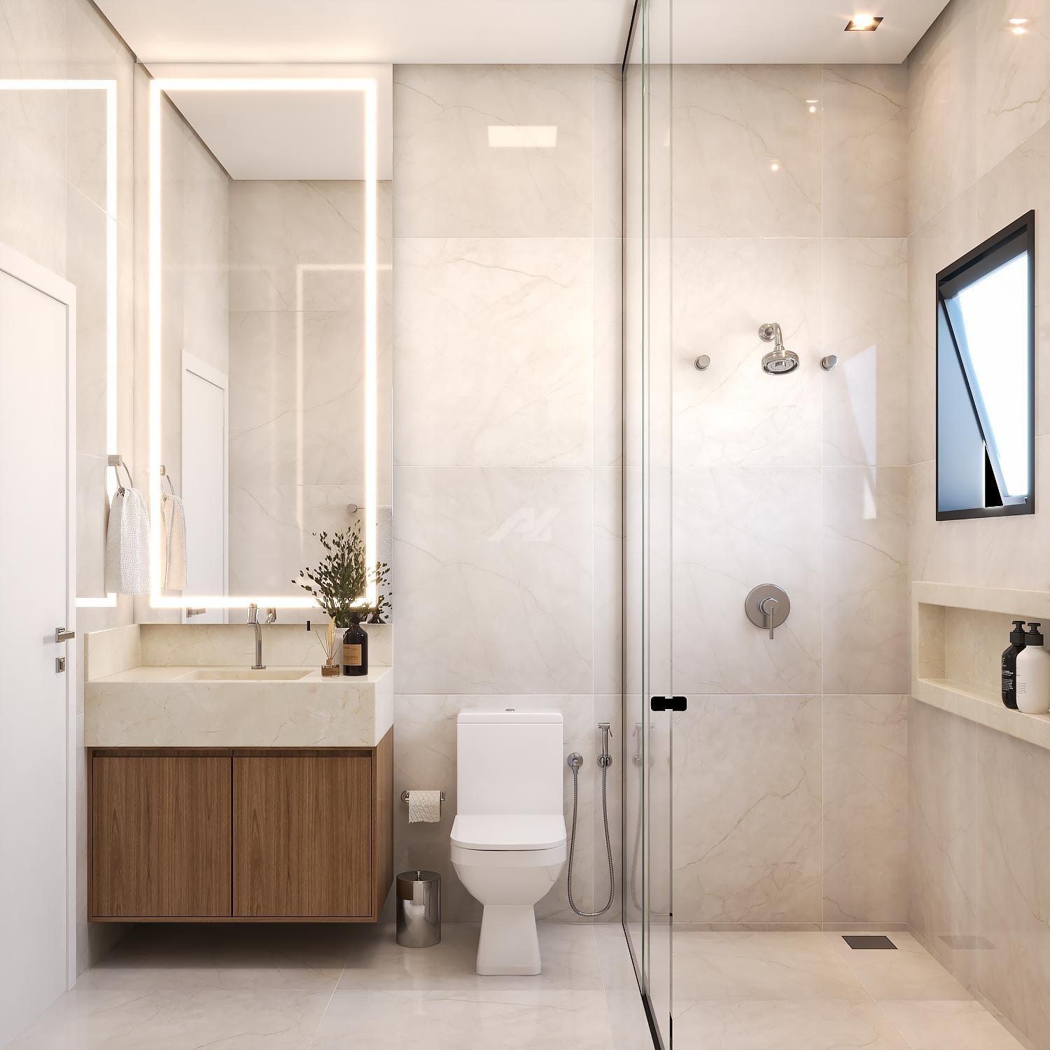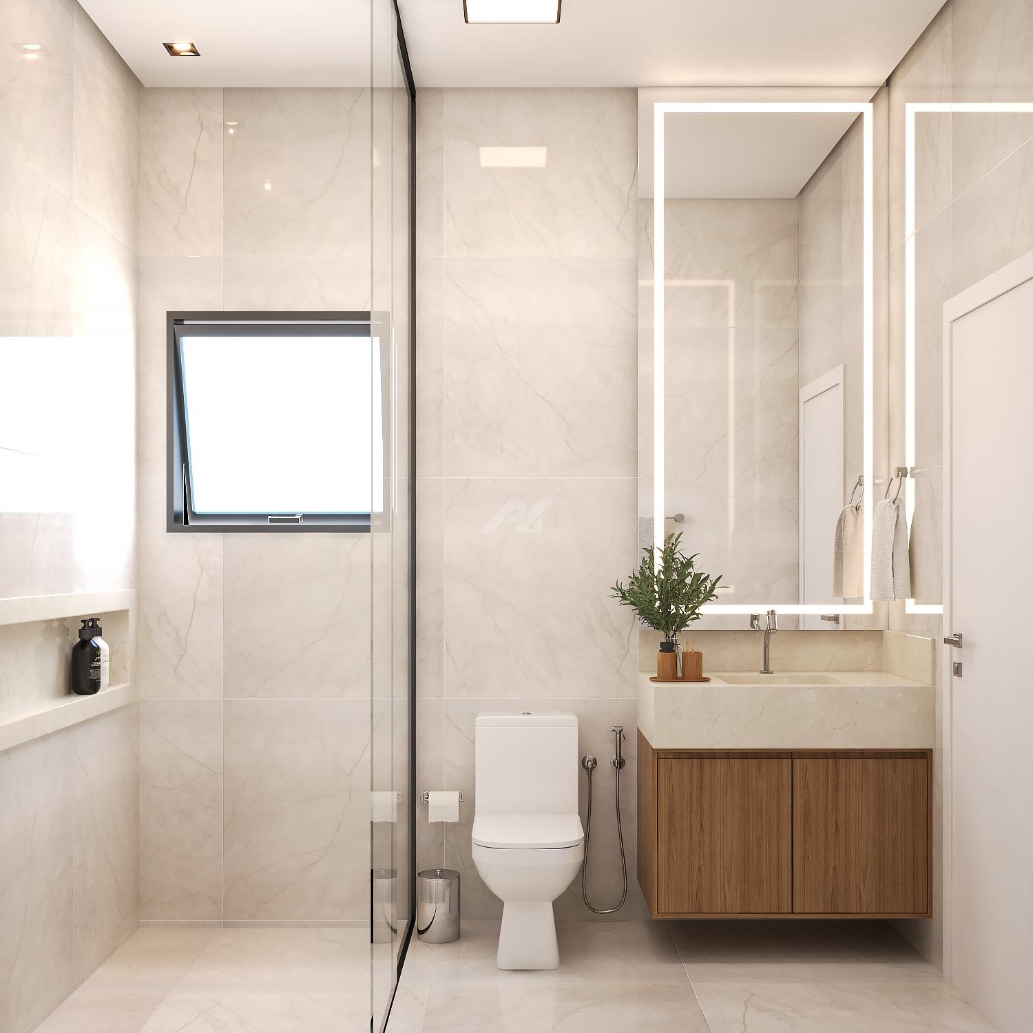 o Box e Espelhos até o Teto nos banheiros, conferindo um acabamento de alto padrão e ampliando a sensação de espaço.