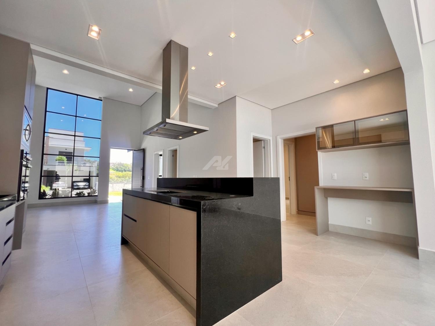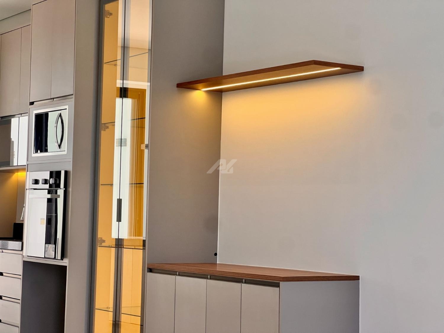 Cozinha com armários planejados, entregue com geladeira, forno elétrico, microondas, cooktop e coifa.