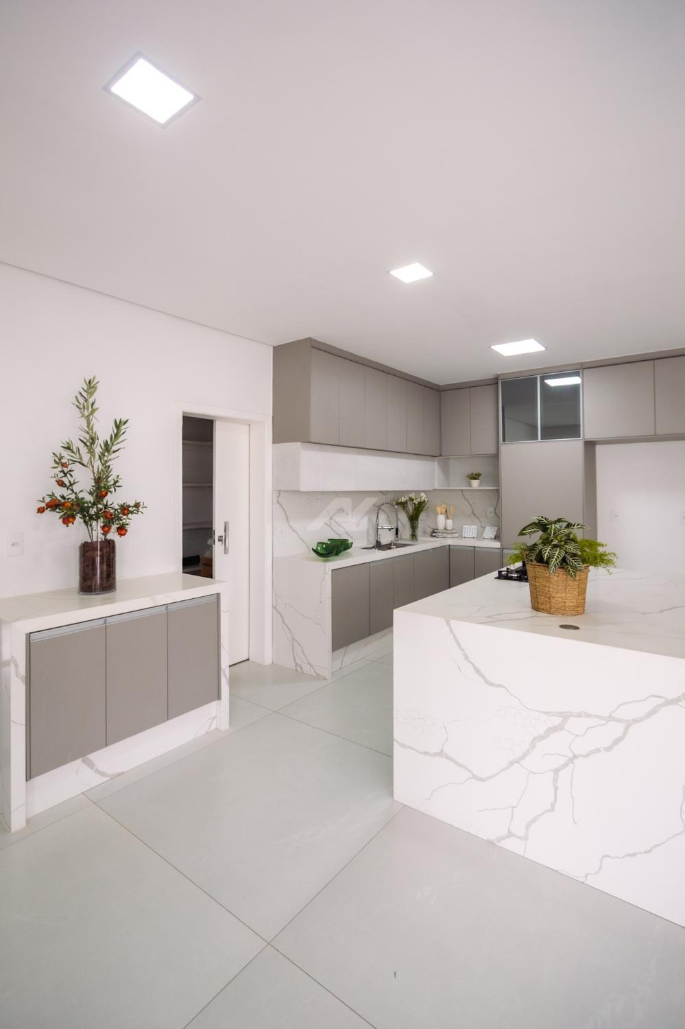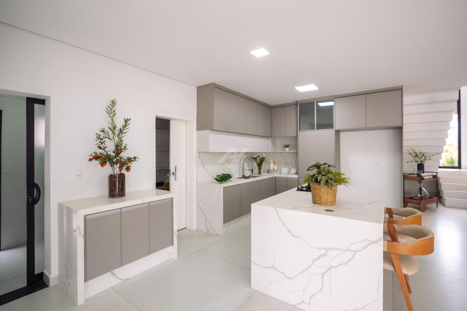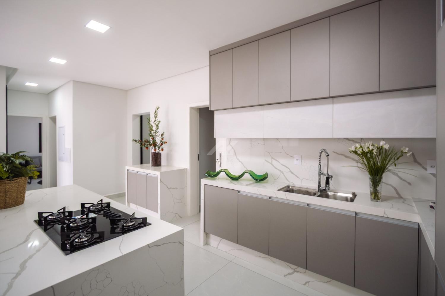 * Ilha e bancadas da cozinha feitas em porcelanato calacáta