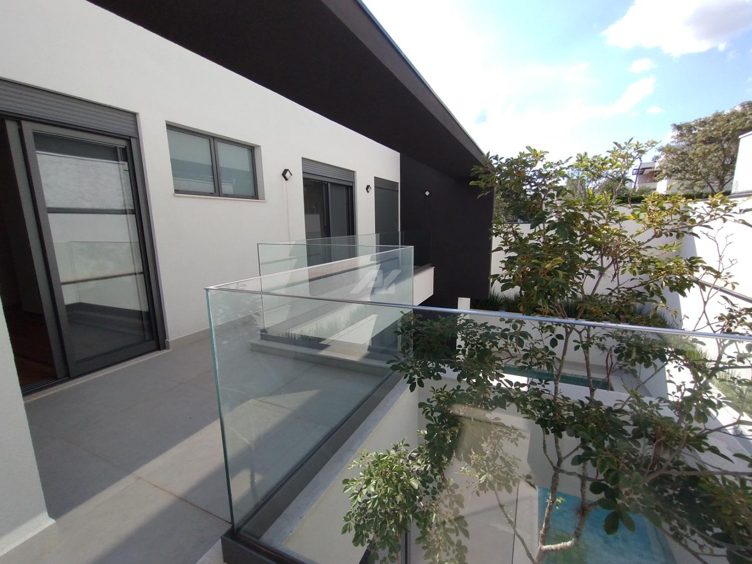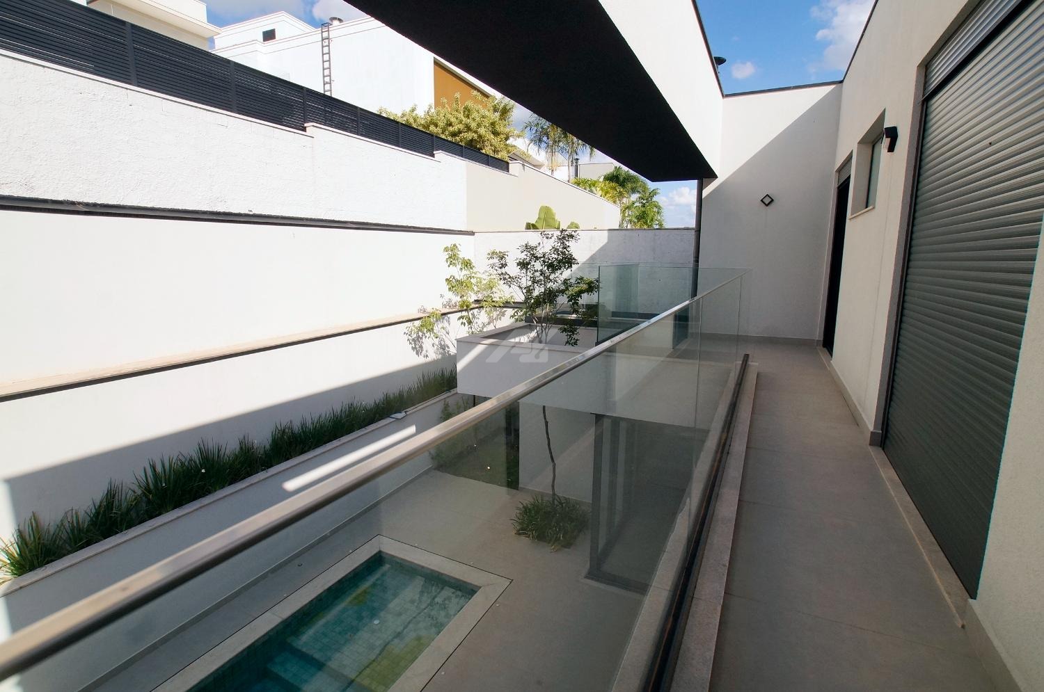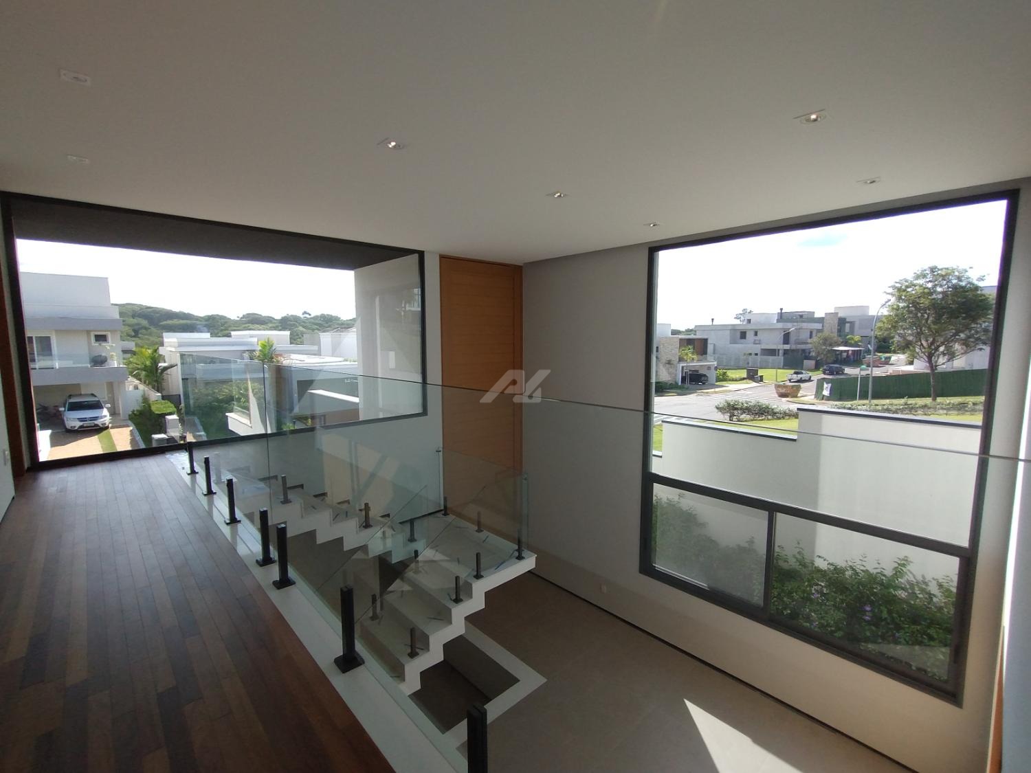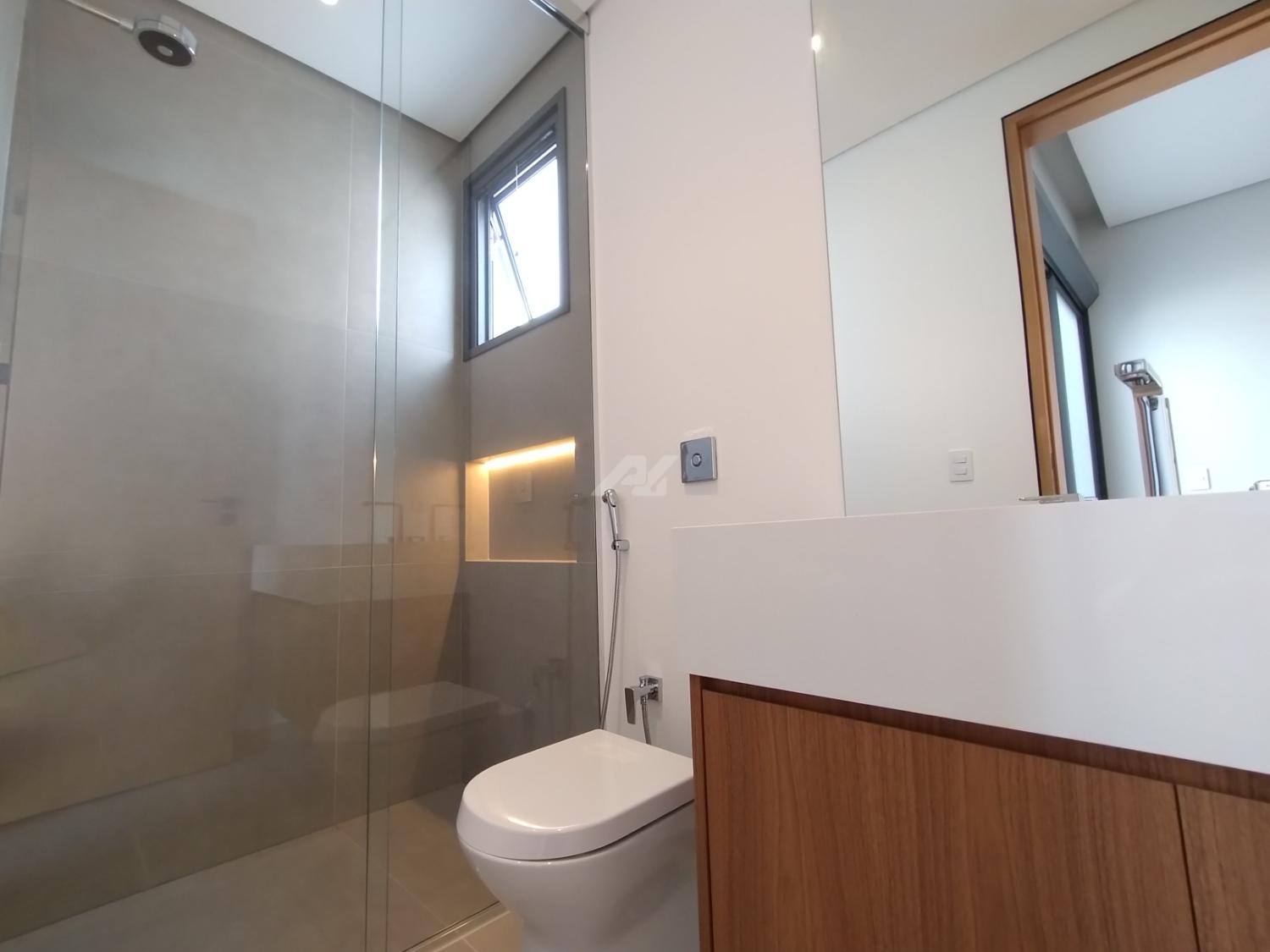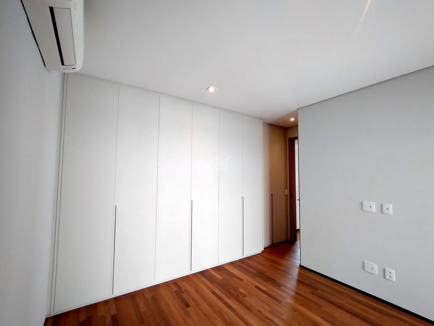 No piso superior, são três suítes completas, todas com armários planejados, persianas elétricas, ar-condicionado e sacada. A suíte master se destaca pelo amplo closet, banheiro com banheira, duas cubas e duas duchas. Há ainda um escritório, com possibilidade de reversão para a quarta suíte.
