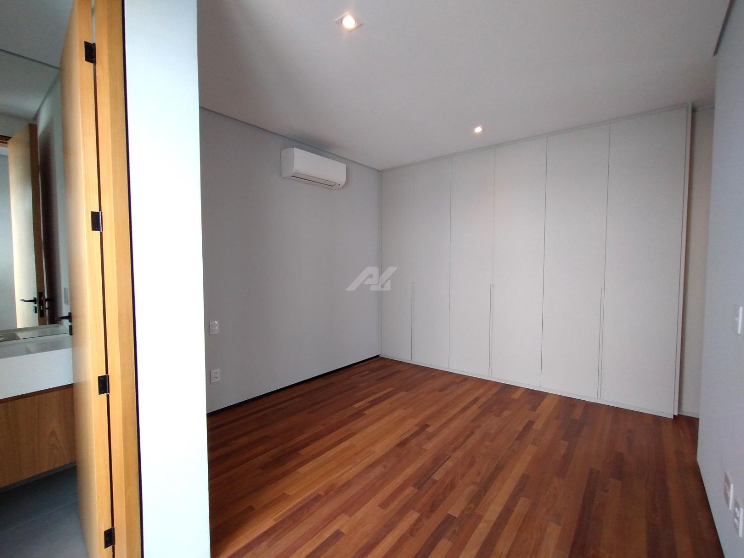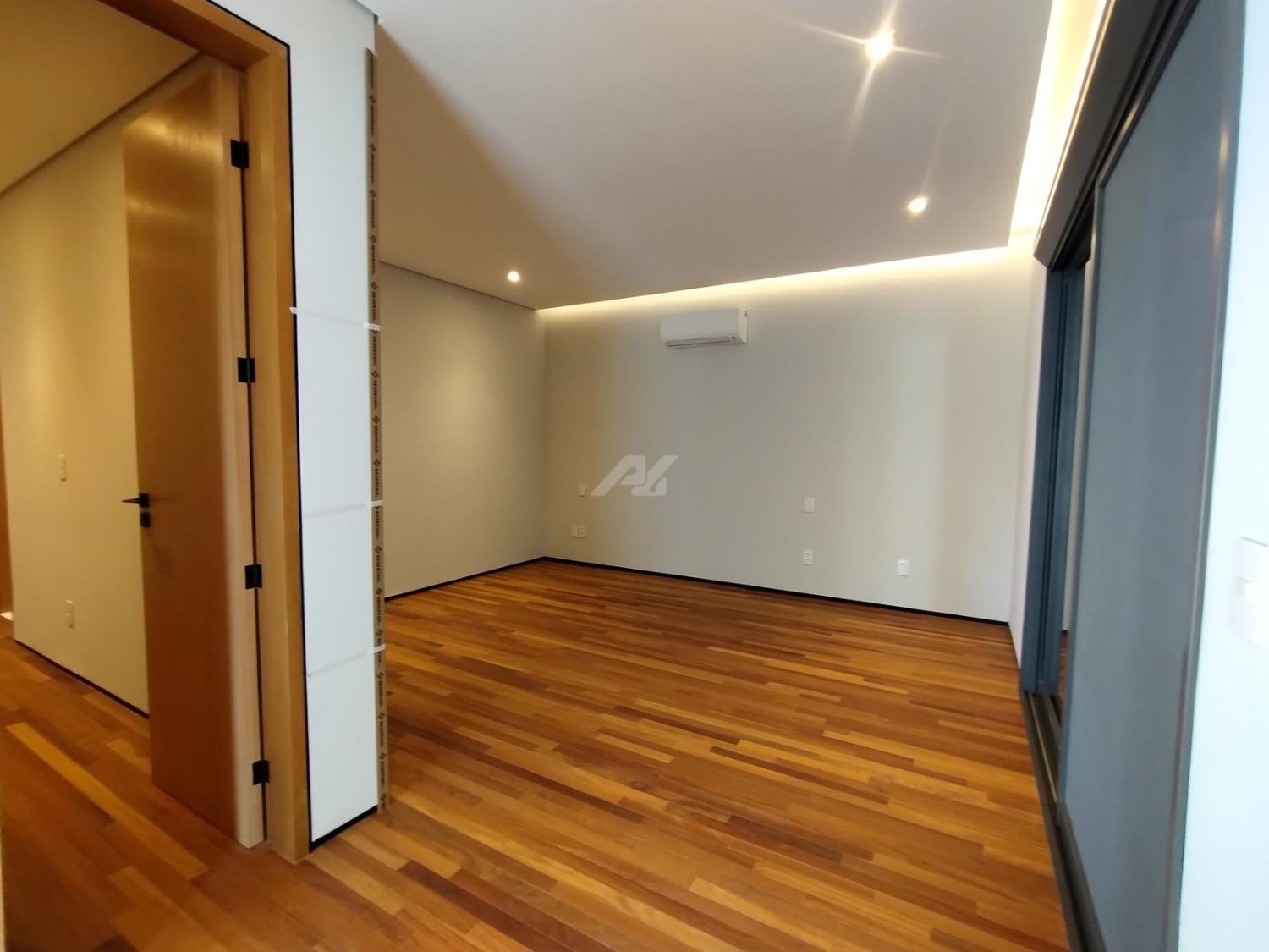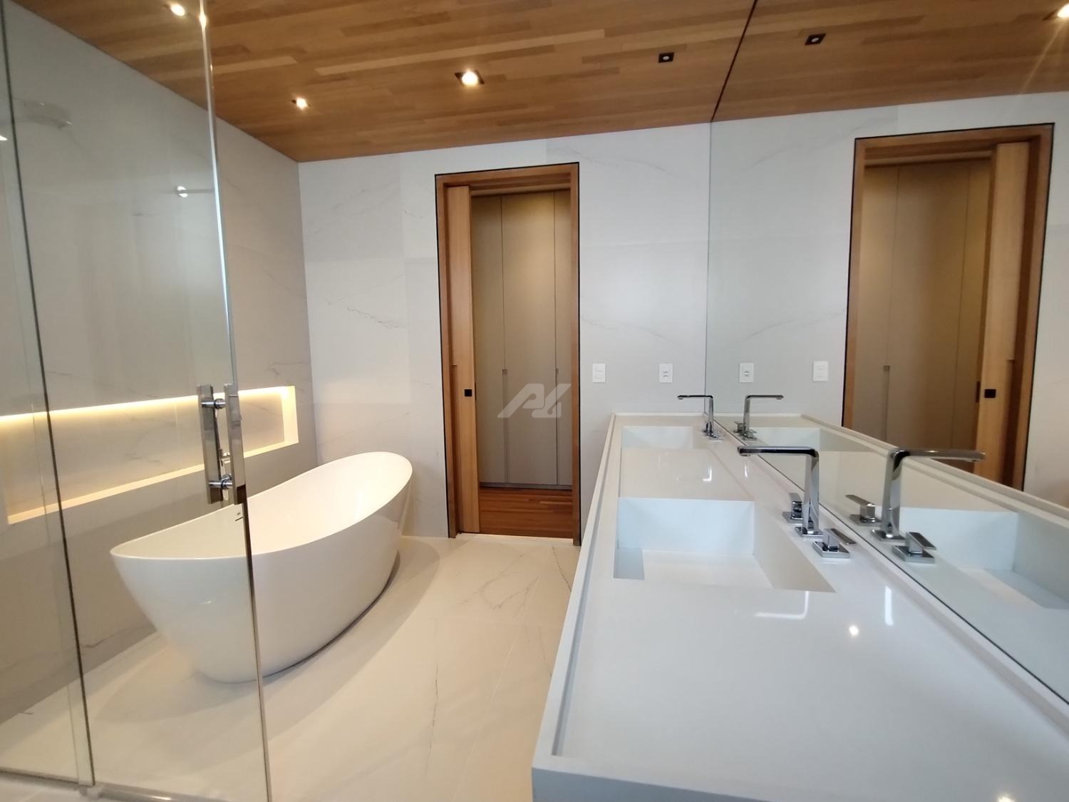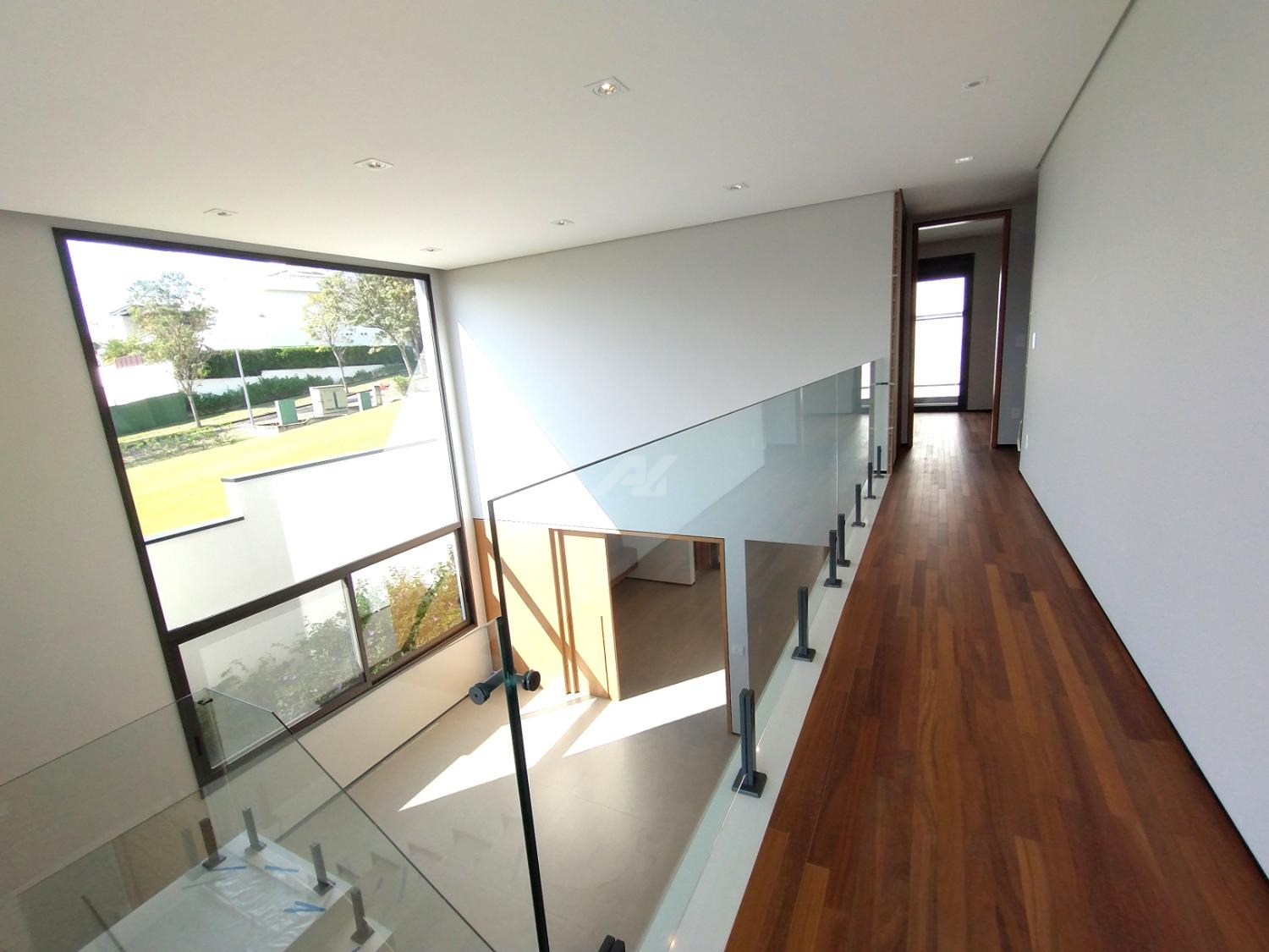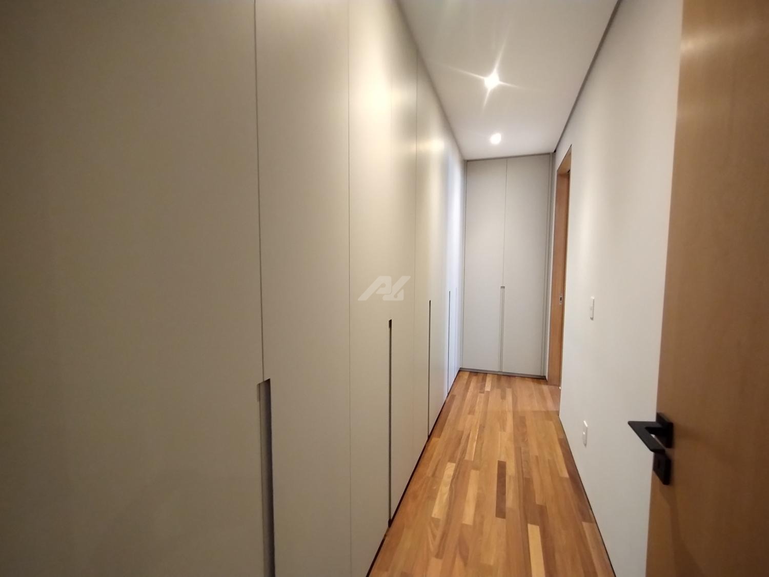 No piso superior, são três suítes completas, todas com armários planejados, persianas elétricas, ar-condicionado e sacada. A suíte master se destaca pelo amplo closet, banheiro com banheira, duas cubas e duas duchas. Há ainda um escritório, com possibilidade de reversão para a quarta suíte.