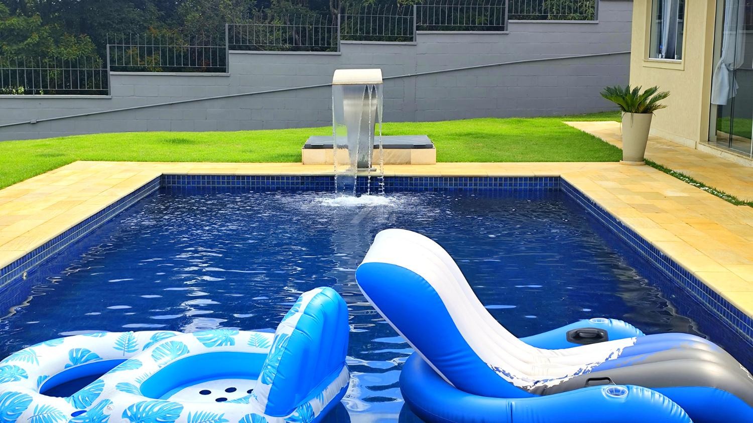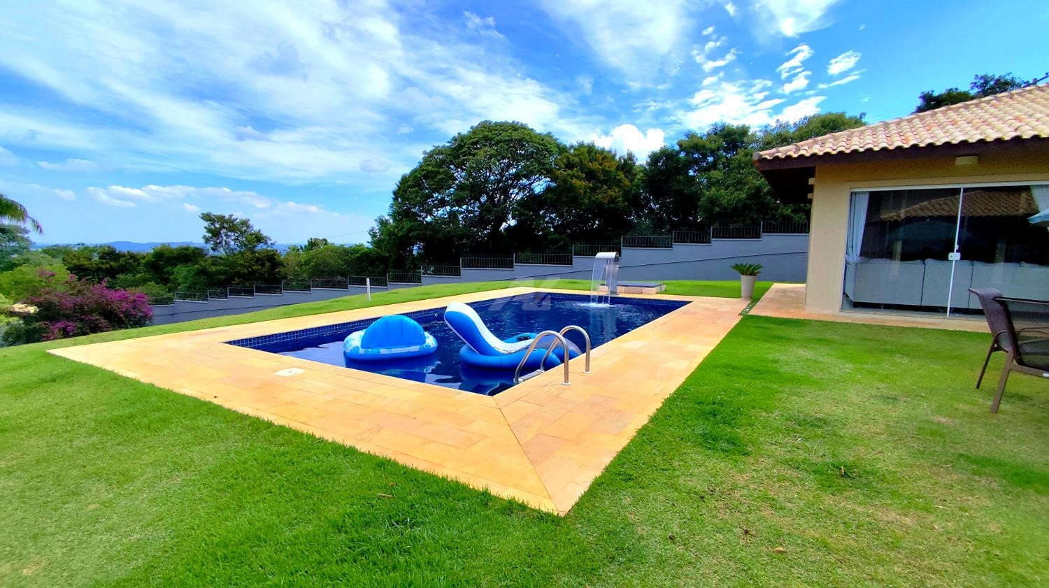 A área externa oferece uma piscina de alvenaria de 8 x 4 metros, além de amplo espaço de lazer com campinho de futebol, perfeito para atividades ao ar livre.