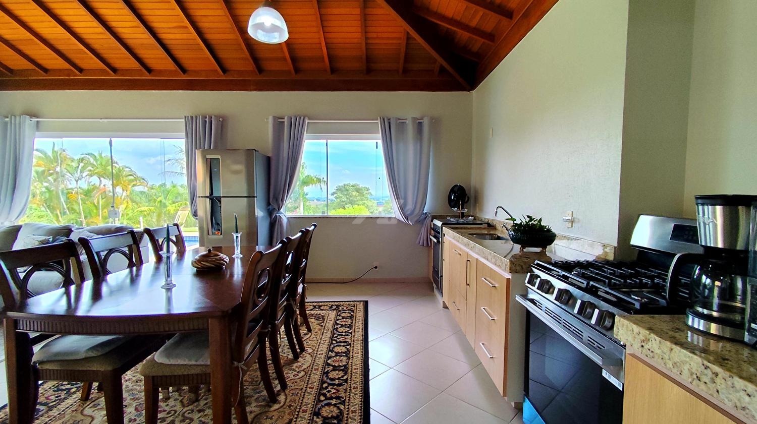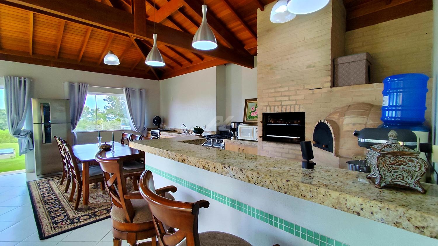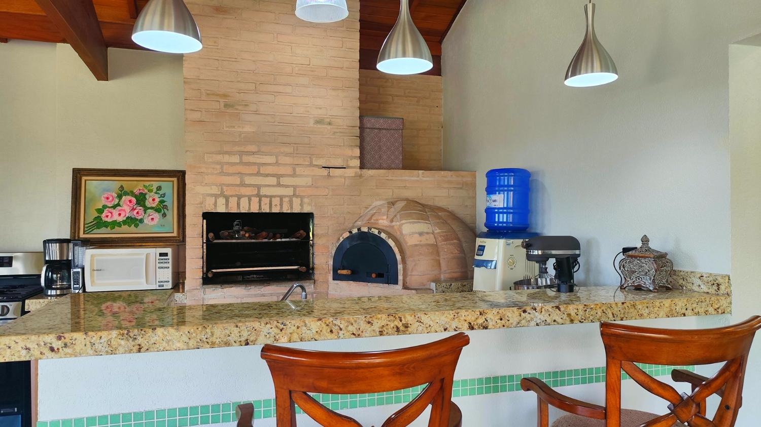 Para momentos de convivência e lazer, a propriedade dispõe de uma casa gourmet independente, com sala e cozinha integradas, banheiro e espaço que pode ser utilizado como segunda lavanderia ou despensa. O espaço gourmet conta ainda com churrasqueira e forno de pizza, ideal para receber amigos e familiares.