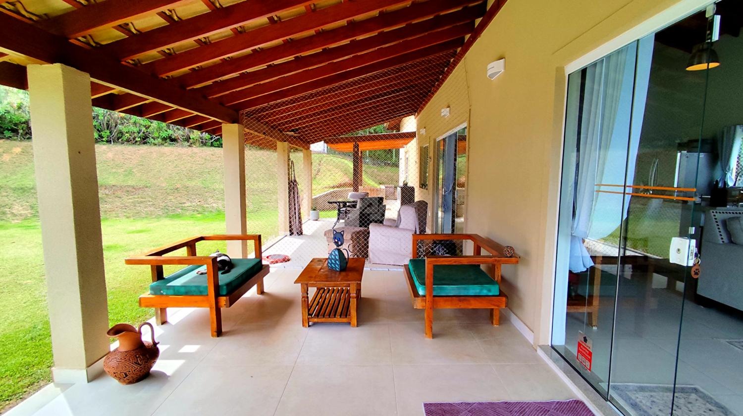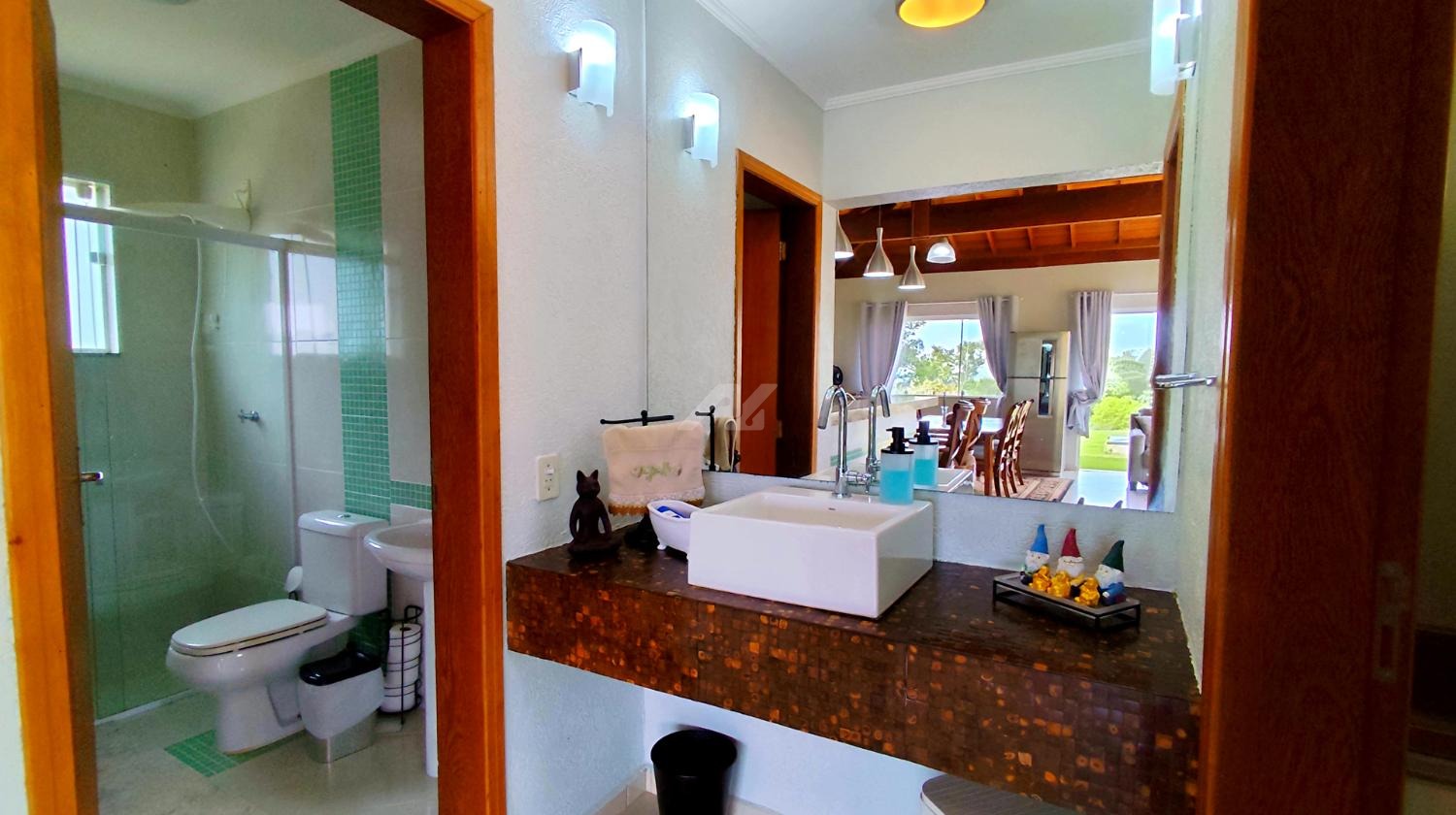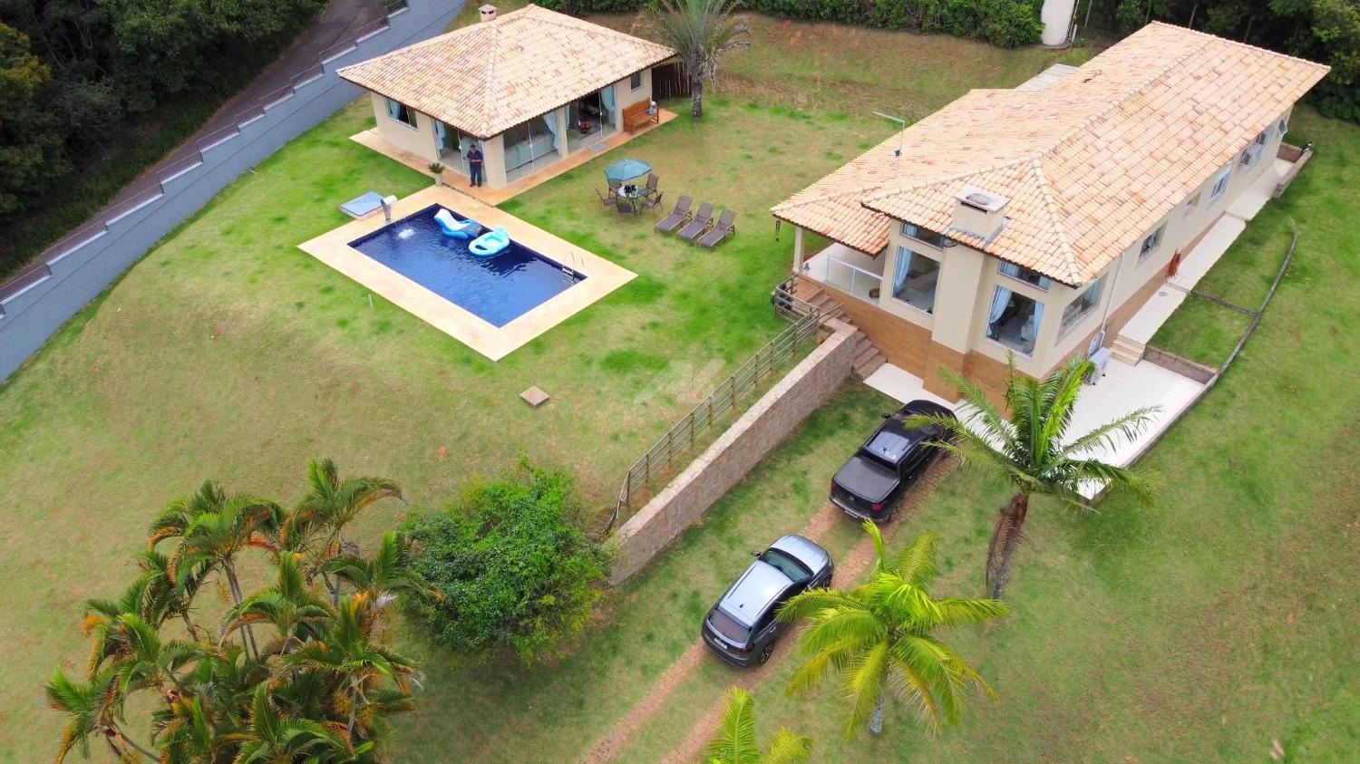 A casa principal oferece ambientes confortáveis e bem distribuídos, com 2 suítes com armários embutidos, sala de estar, cozinha, lavabo e ampla varanda que contorna a lateral da sala, cozinha e suíte principal, proporcionando integração com a natureza ao redor. O imóvel ainda conta com lavanderia e porão, além de ar-condicionado na sala, cozinha e dormitórios. O abastecimento de água é feito por poço, com pressurizador na casa principal, garantindo excelente funcionamento hidráulico.