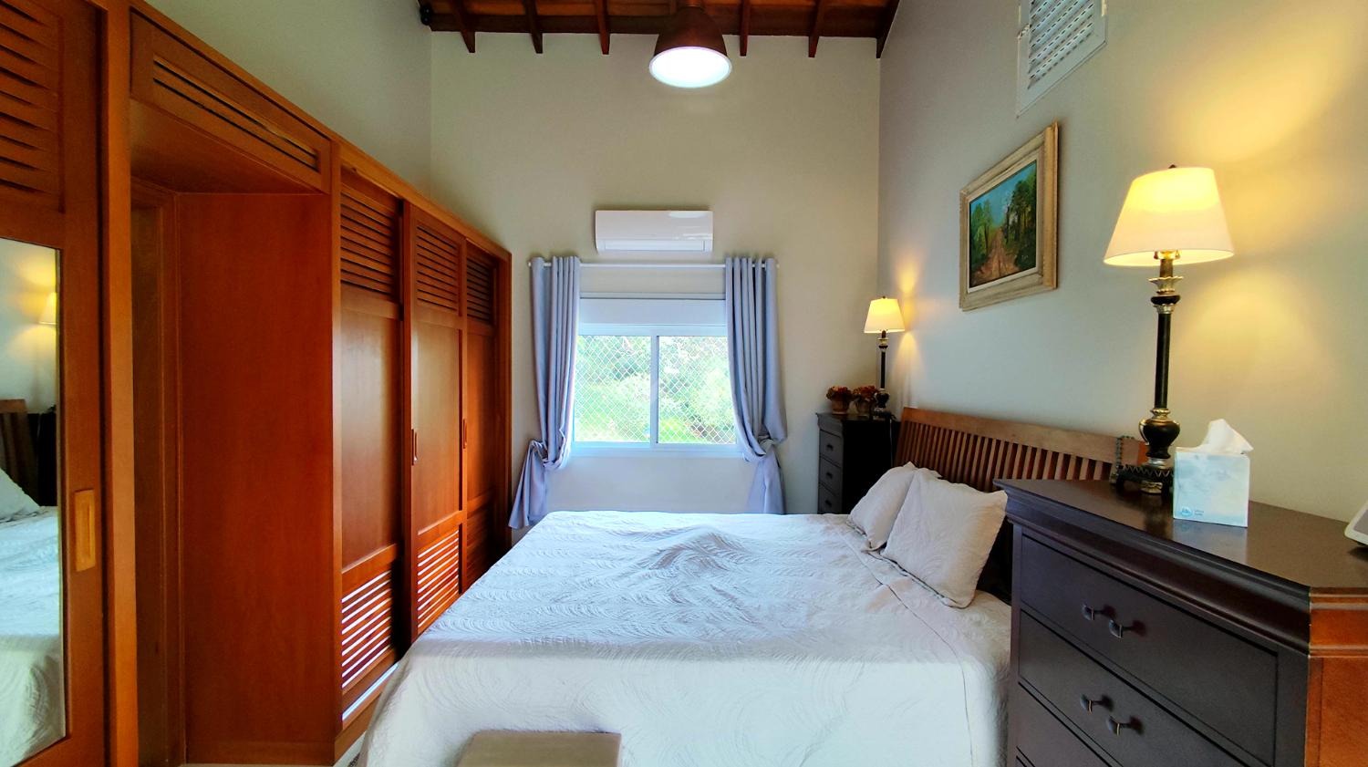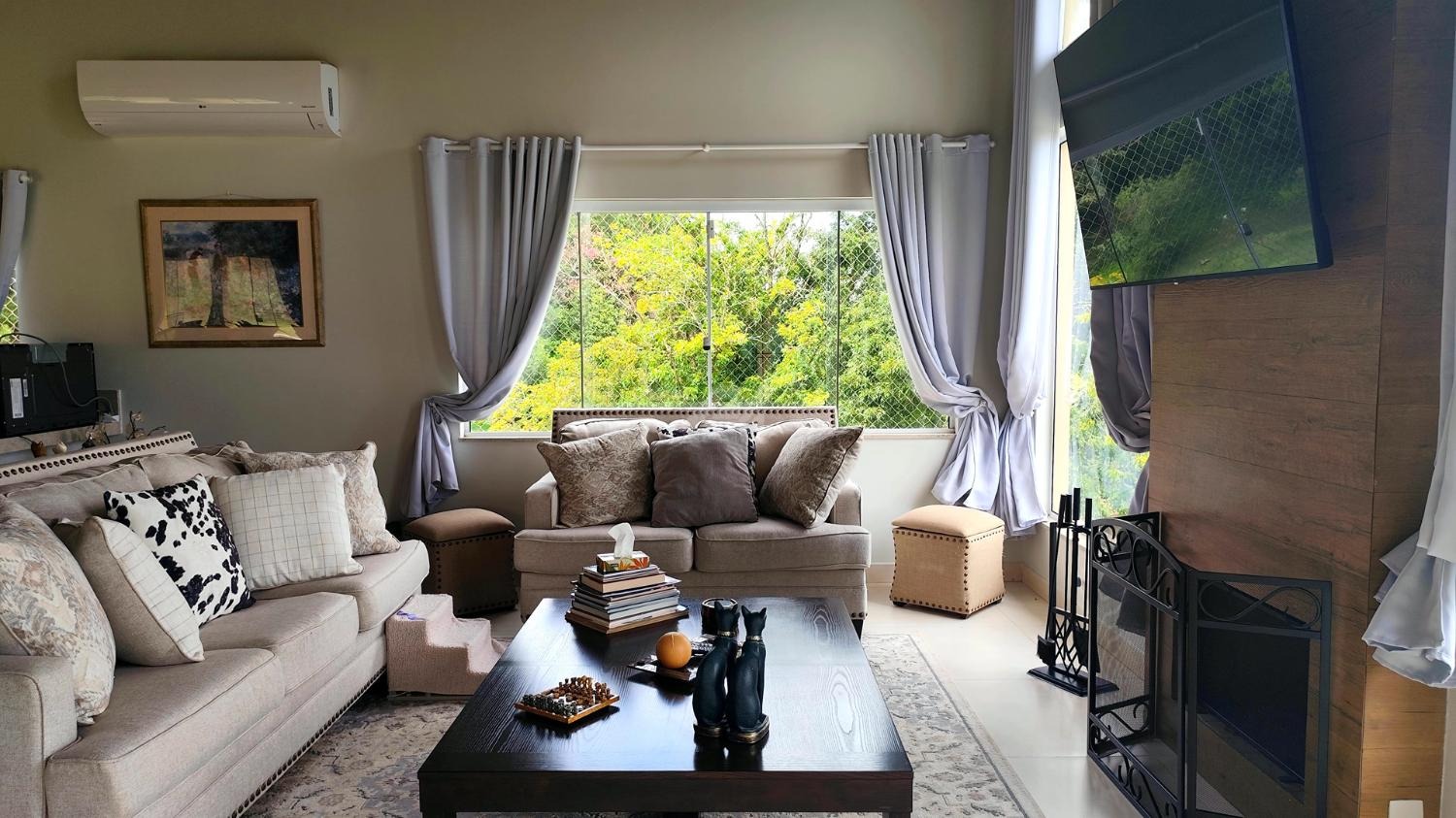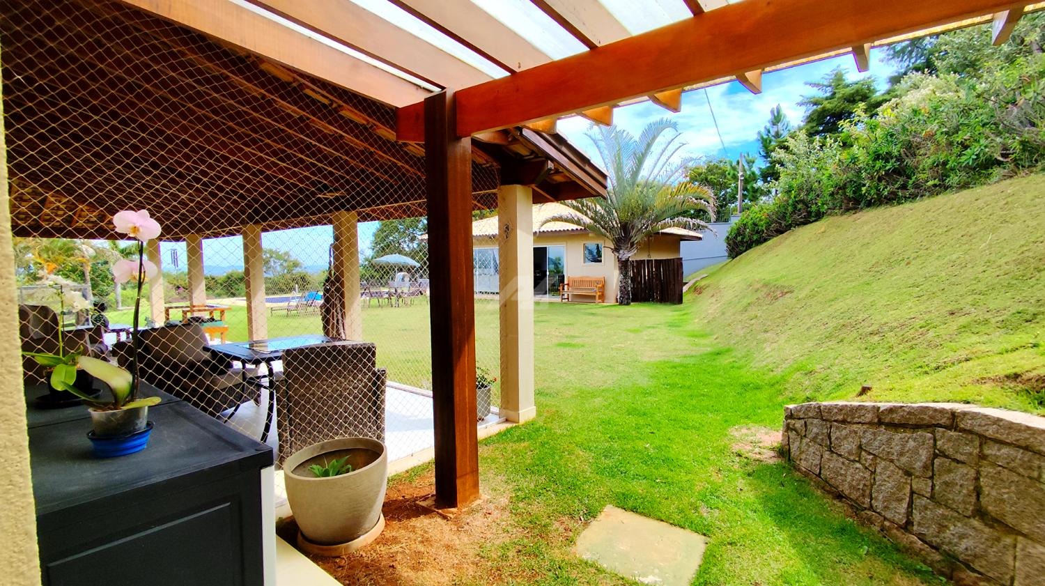 A casa principal oferece ambientes confortáveis e bem distribuídos, com 2 suítes com armários embutidos, sala de estar, cozinha, lavabo e ampla varanda que contorna a lateral da sala, cozinha e suíte principal, proporcionando integração com a natureza ao redor. O imóvel ainda conta com lavanderia e porão, além de ar-condicionado na sala, cozinha e dormitórios. O abastecimento de água é feito por poço, com pressurizador na casa principal, garantindo excelente funcionamento hidráulico.