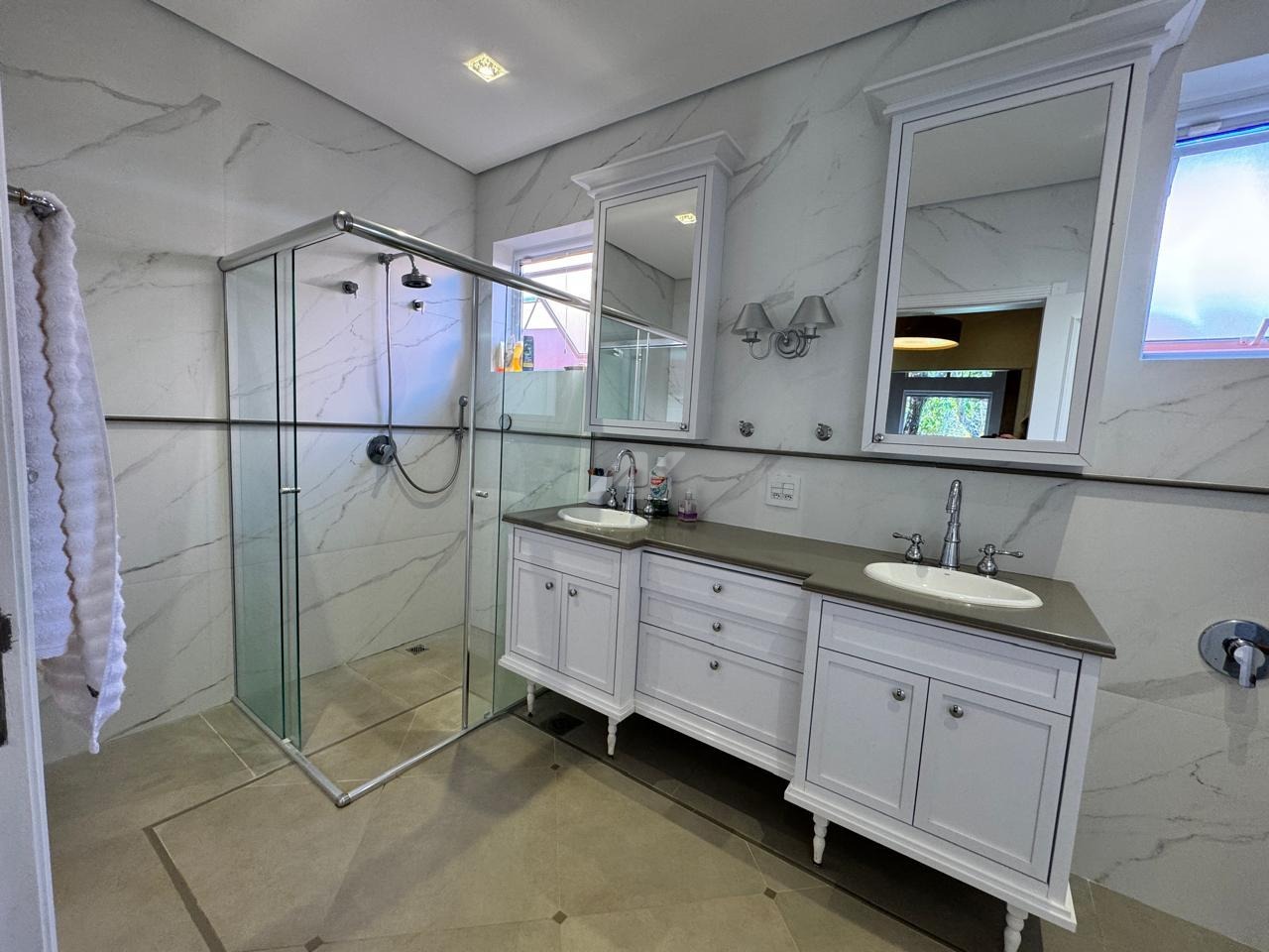 Com 340,74 m² de área construída, a casa conta com 3 quartos, sendo 3 suítes amplas, distribuídas em um terreno generoso, com posição solar pela manhã e ambientes bem arejados. A topografia em declive garante uma vista diferenciada.
