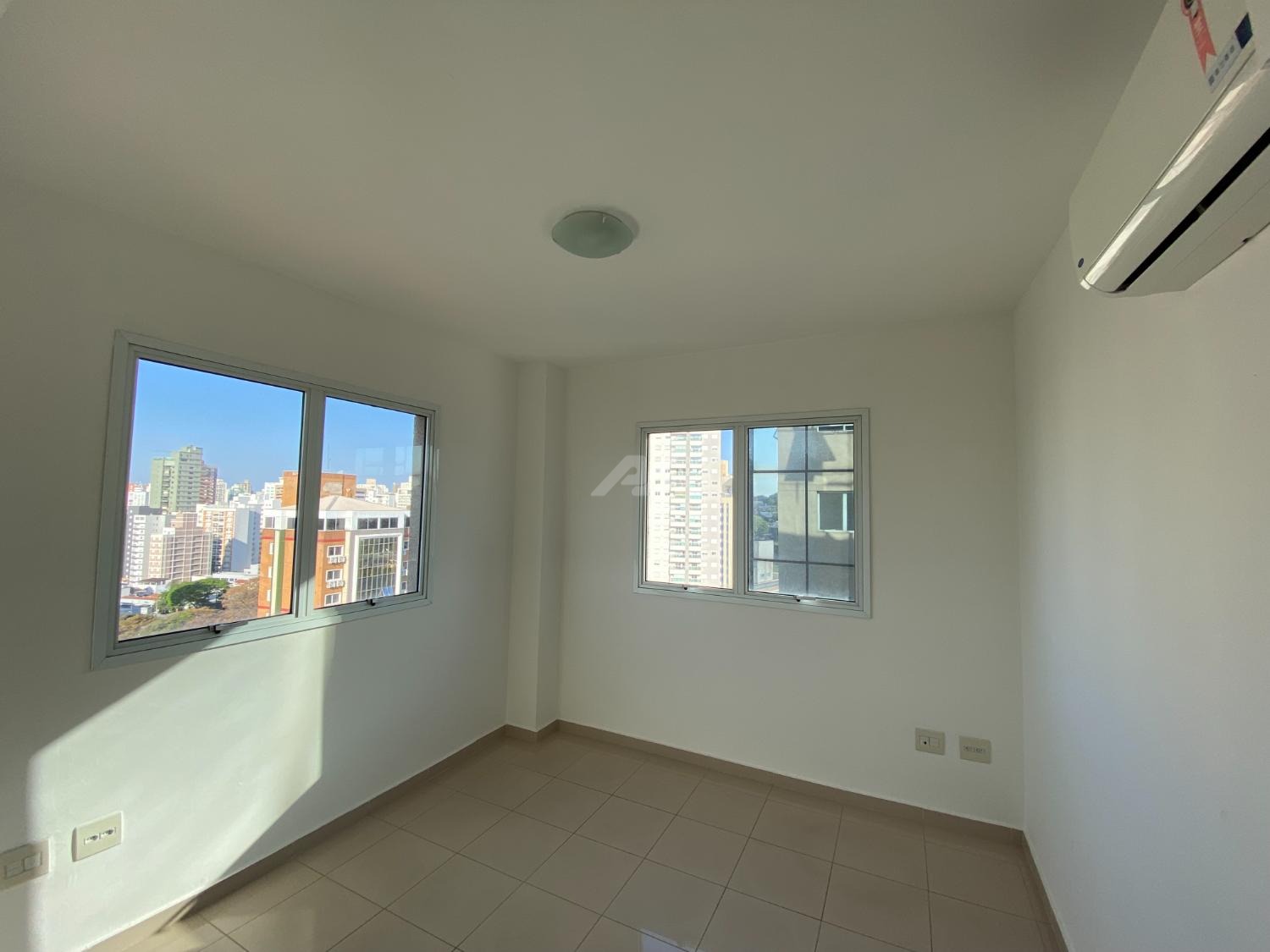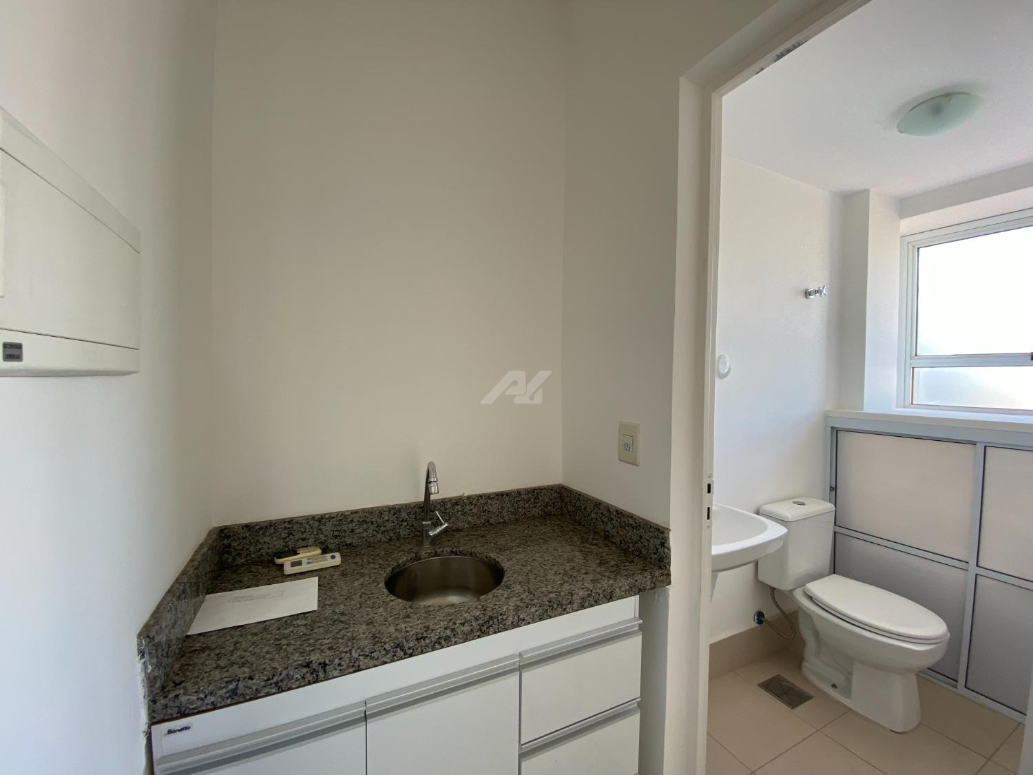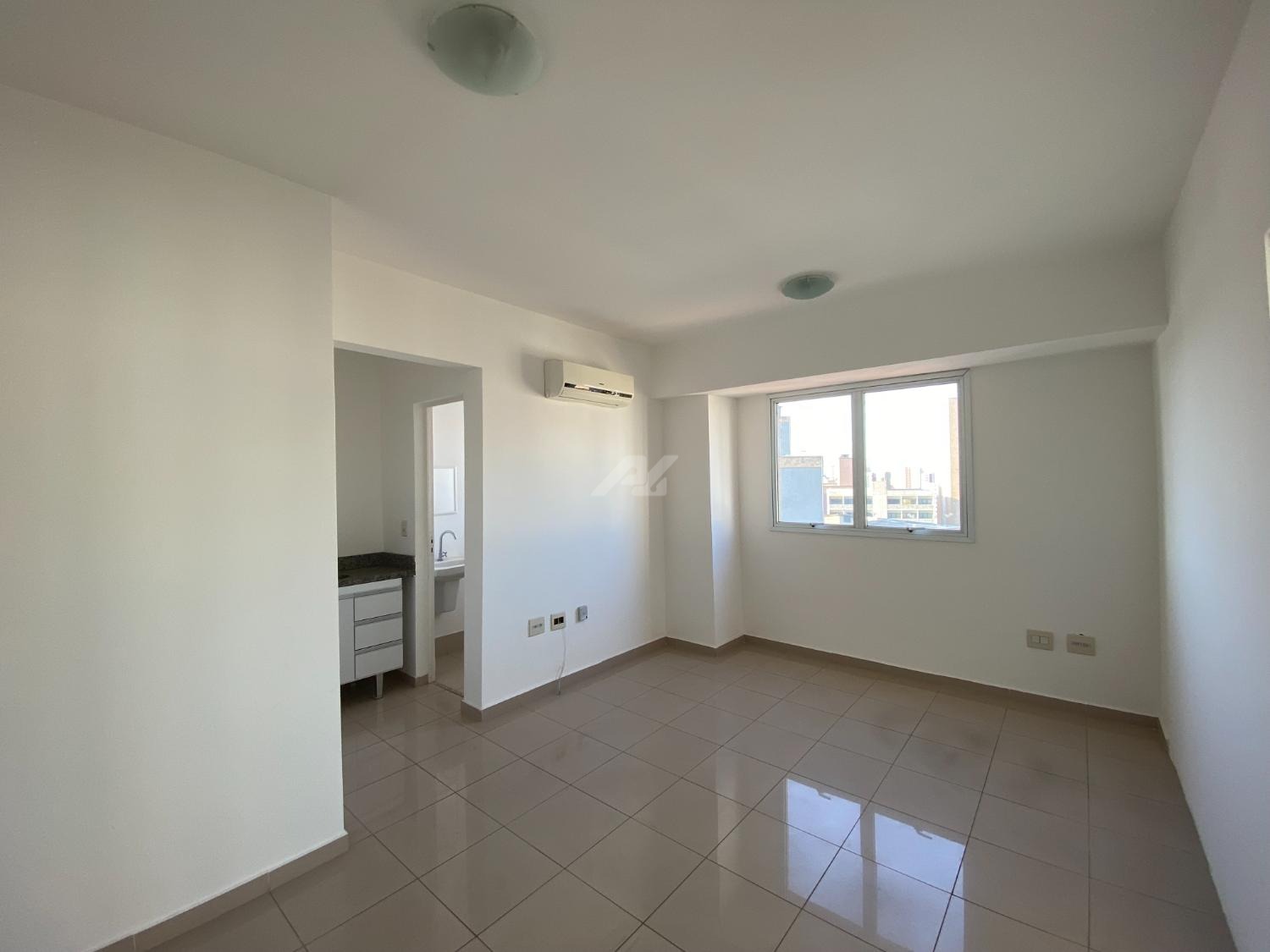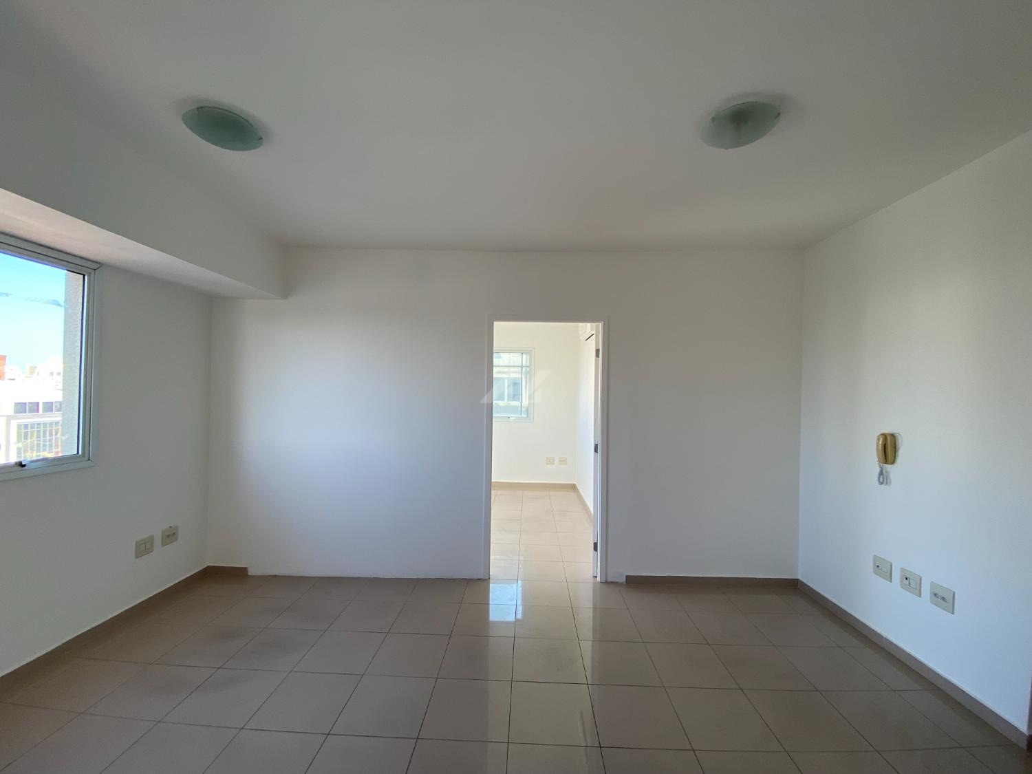 Sala com 46m², divisória performando 2 salas, ar condicionado, banheiro e garagem coberta.